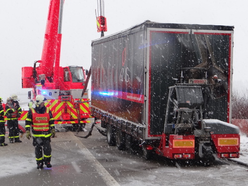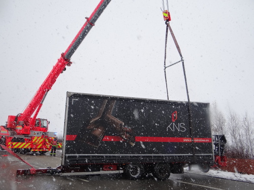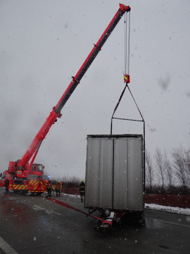 Dvě jednotky profesionálních hasičů (HZS MSK) zasahovaly ve čtvrtek 30.11.2017 odpoledne na dálnici D1 na úrovni Ostravy-Polanky nad Odrou, kde narazil kamion s přívěsem do svodidel. Řidič vyvázl bez zranění, hasiči museli pomocí Bizona a jeřábu vyprostit a odtáhnout na odstavný pruh velký přívěs. Dálnice ve z Klimkovic na Ostravu byla zhruba půlhodiny zcela uzavřena, tvořila se několikakilometrová fronta vozidel.