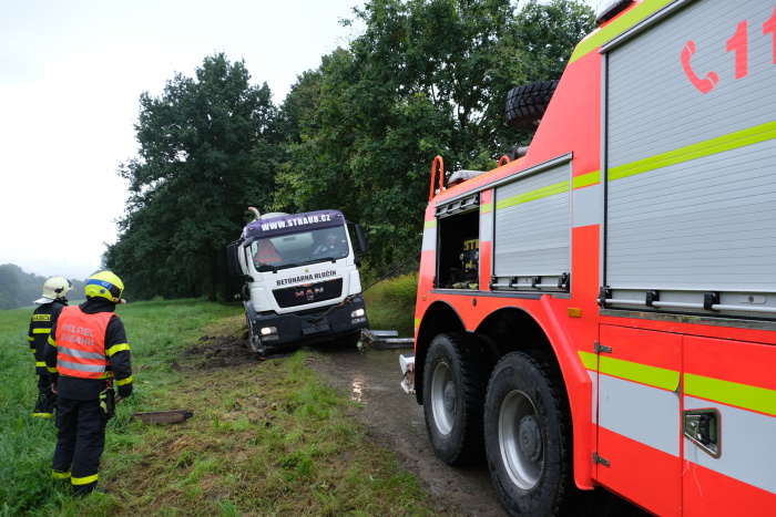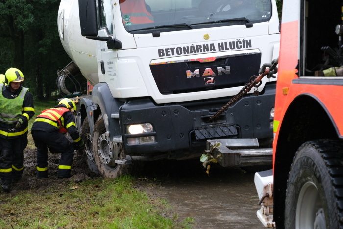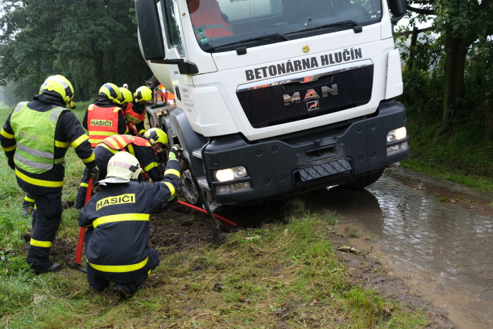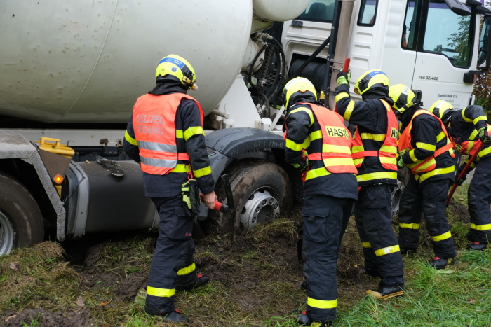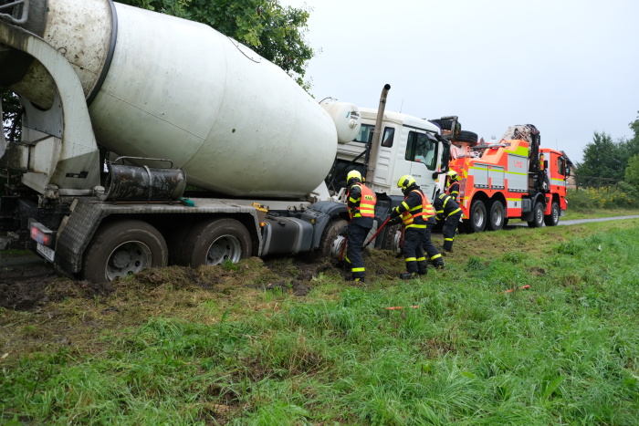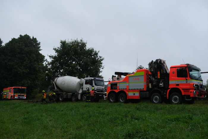 Dvě jednotky profesionálních hasičů (HZS MSK) zasahovaly v úterý 31.8.2021 dopoledne v Ostravě-Lhotce u nehody domíchávače MAN s šesti tunami betonu, který zapadl pravými koly do deštěm rozmáčeného trávníku vedle řádně označené cyklostezky, vedoucí z okraje Ostravy, místní část Lhotka, do Hlučína, místní části Bobrovníky. Po přečerpání betonu firmou na náhradní vozidlo museli hasiči obkopat zapadlá kola domíchávače o hmotnosti kolem 16 tun a opatrně jej vytáhnout zadním silným navijákem vyprošťovacího speciálu MB Actros Bizon.