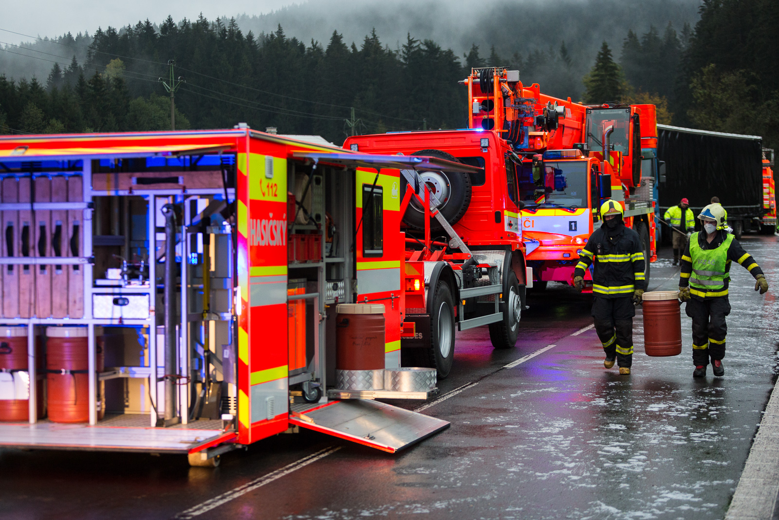 K události tak byl na žádost velitele zásahu vyslán vyprošťovací speciál Bison a spolu s ním těžkotonážní jeřáb Demag - oba vozy ze stanice HZS MSK v Ostravě-Zábřehu. Těžká technika kamion pomocí jeřábu a navijáků vytáhla na pevnou krajnici.