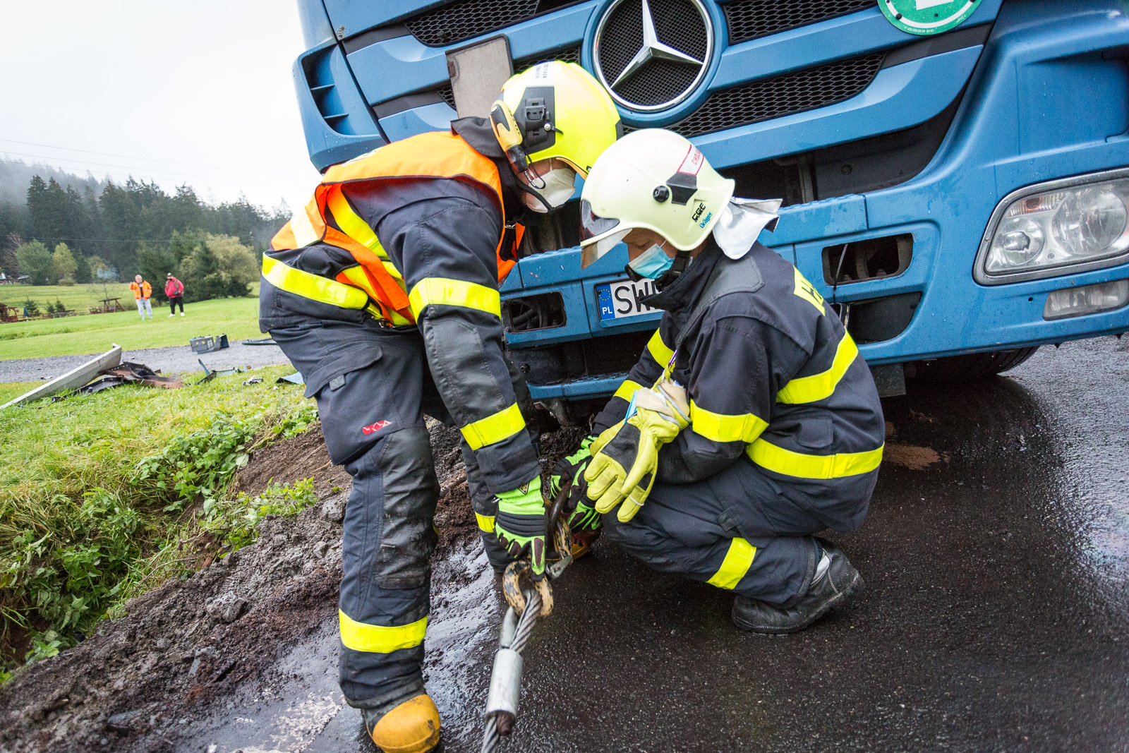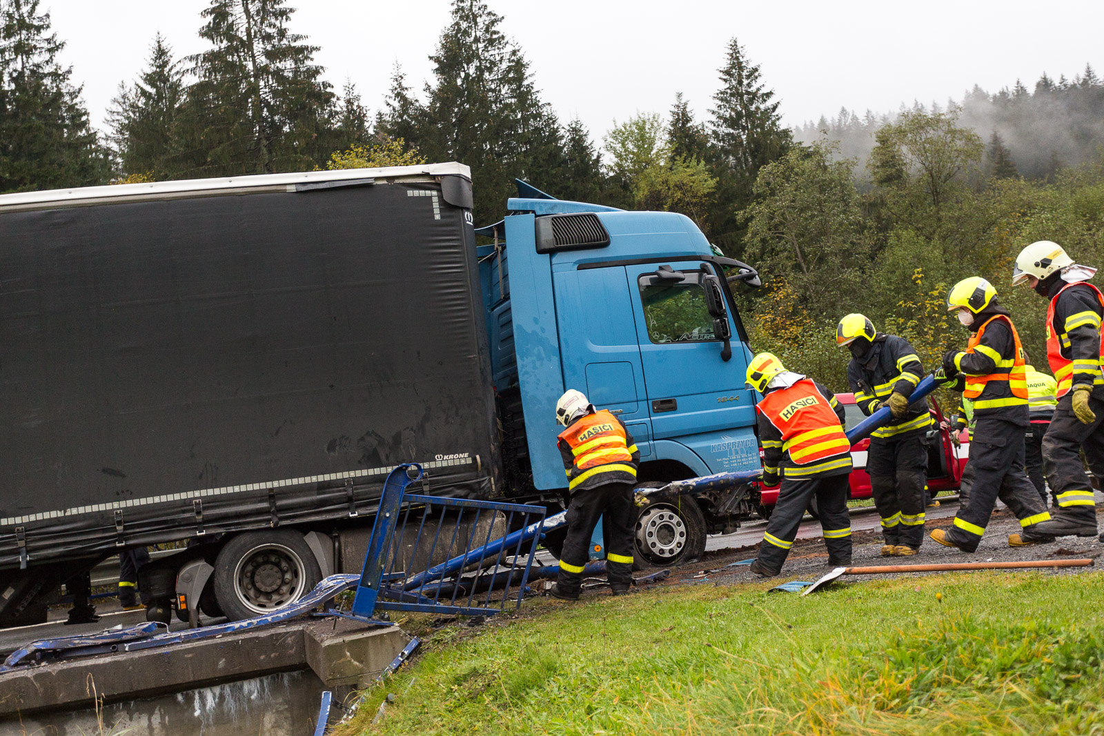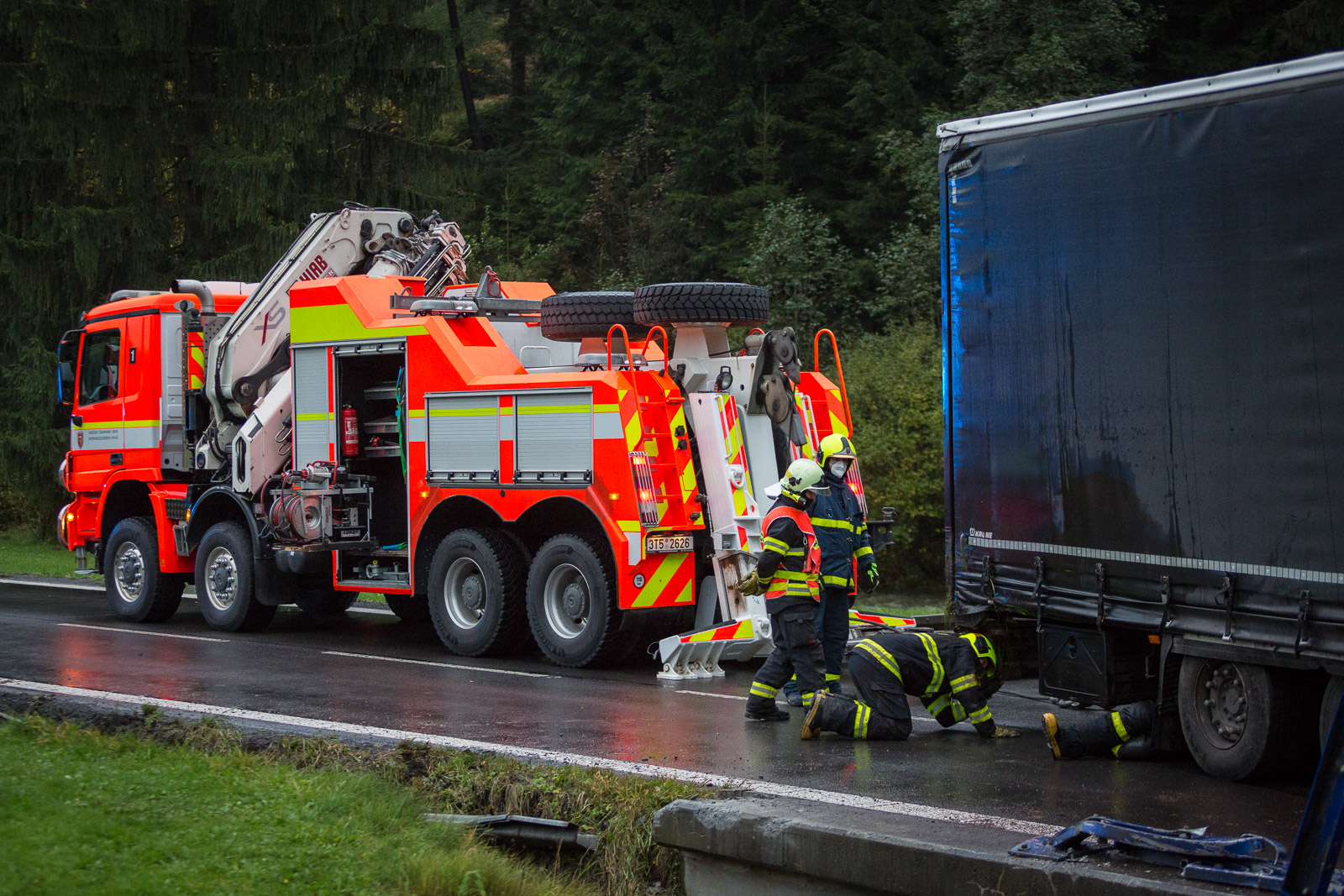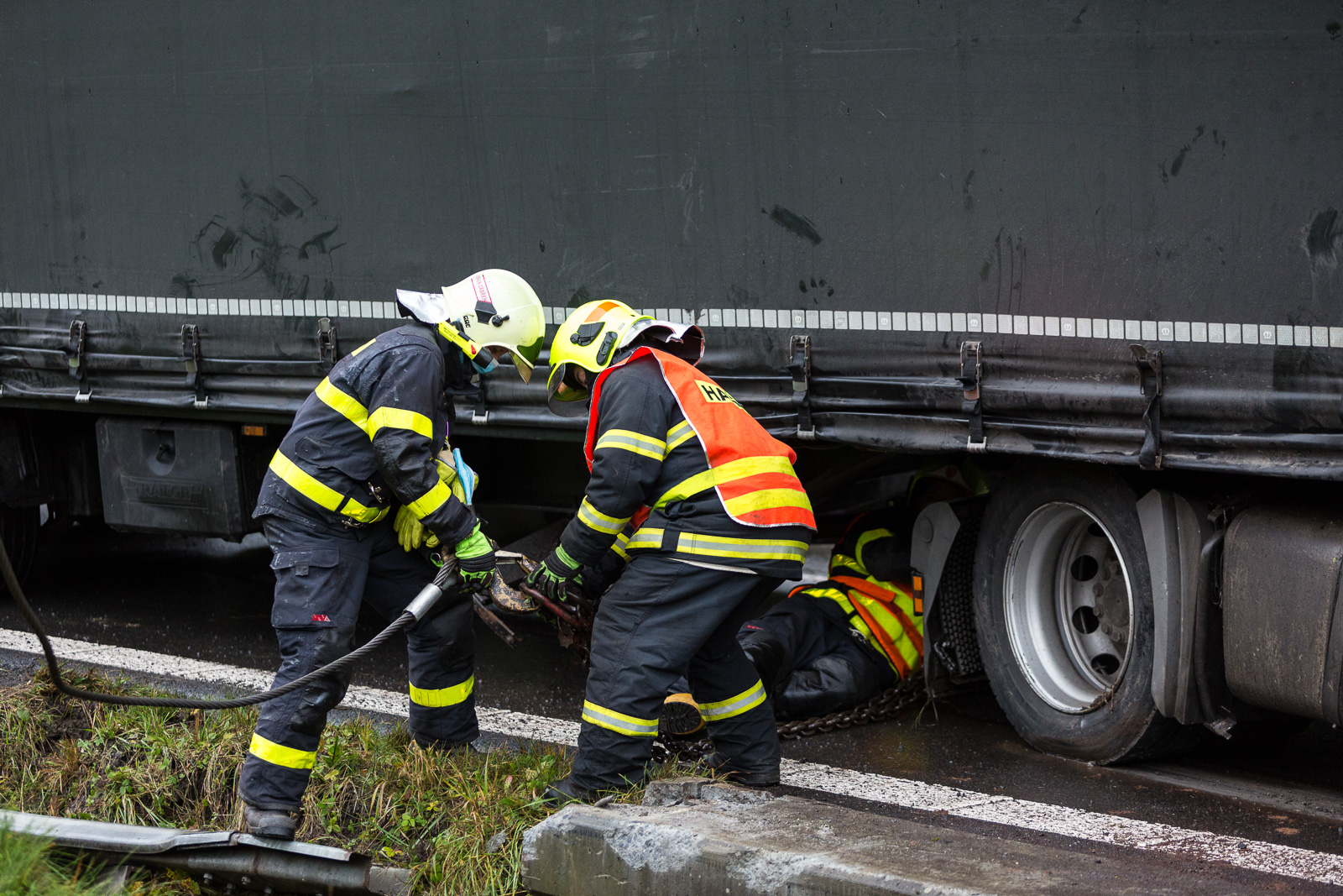 Vzhledem ke stálému drobnému úniku provozních kapalin z poškozených podvozkových částí nákladního vozu bylo rozhodnuto o tom, že hasiči kamion vyprostí zpět na komunikaci.