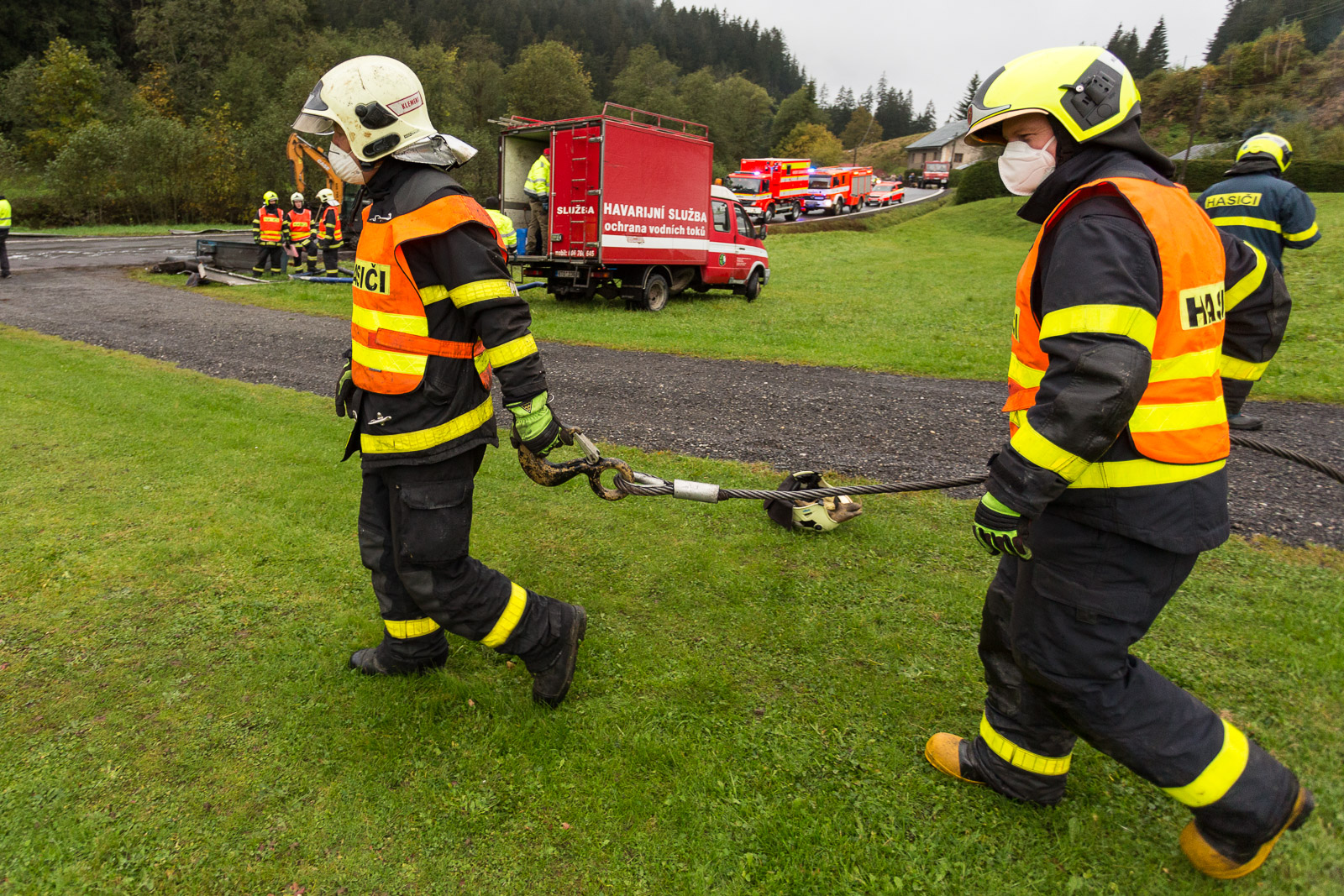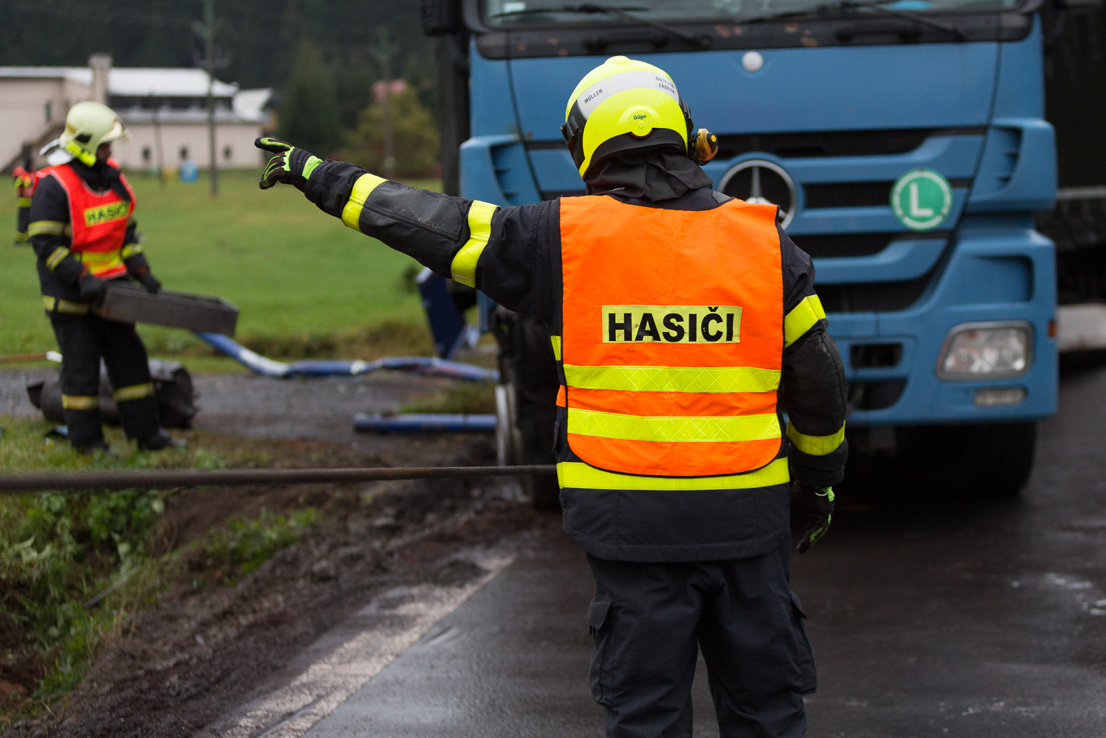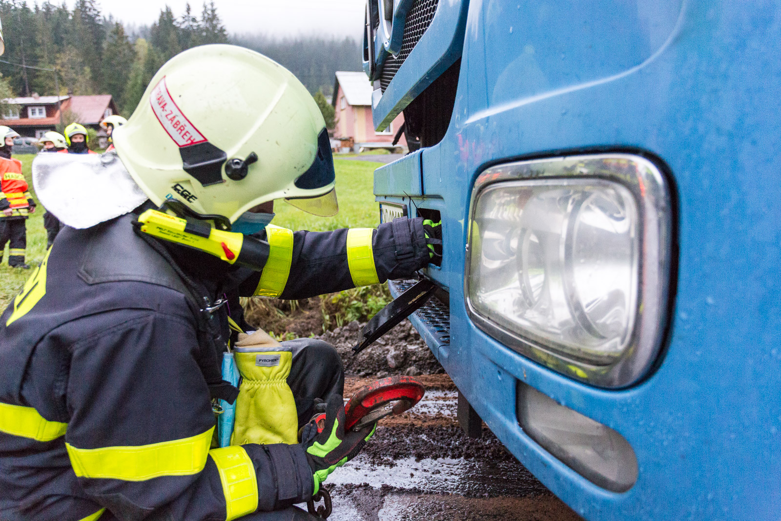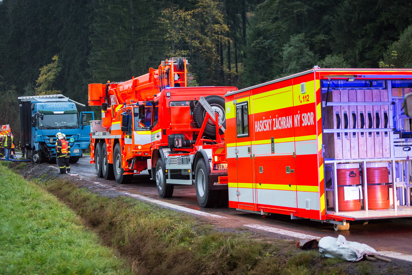 Vzhledem ke stálému drobnému úniku provozních kapalin z poškozených podvozkových částí nákladního vozu bylo rozhodnuto o tom, že hasiči kamion vyprostí zpět na komunikaci.