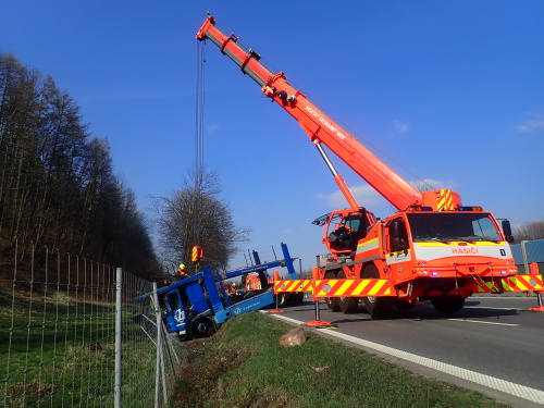 Hasiči vyprostili z příkopu kamion, který jel s prázdným návěsem a přívěsem na převoz osobních automobilů, pomocí jeřábu, Bizon jej tradičně jistil lanem zadního navijáku. Hasiči zachytili únik provozních kapalin do půdy, předtím z kamionu uniklo jen několik litrů nafty.