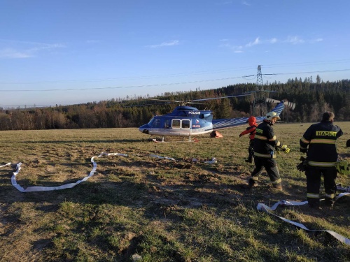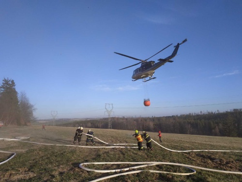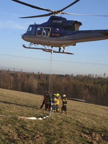 Policejnímu vrtulníku se ve spolupráci s hasiči podařilo shodit 800 litrů vody z bambi vaku na místo požáru celkem 12x.