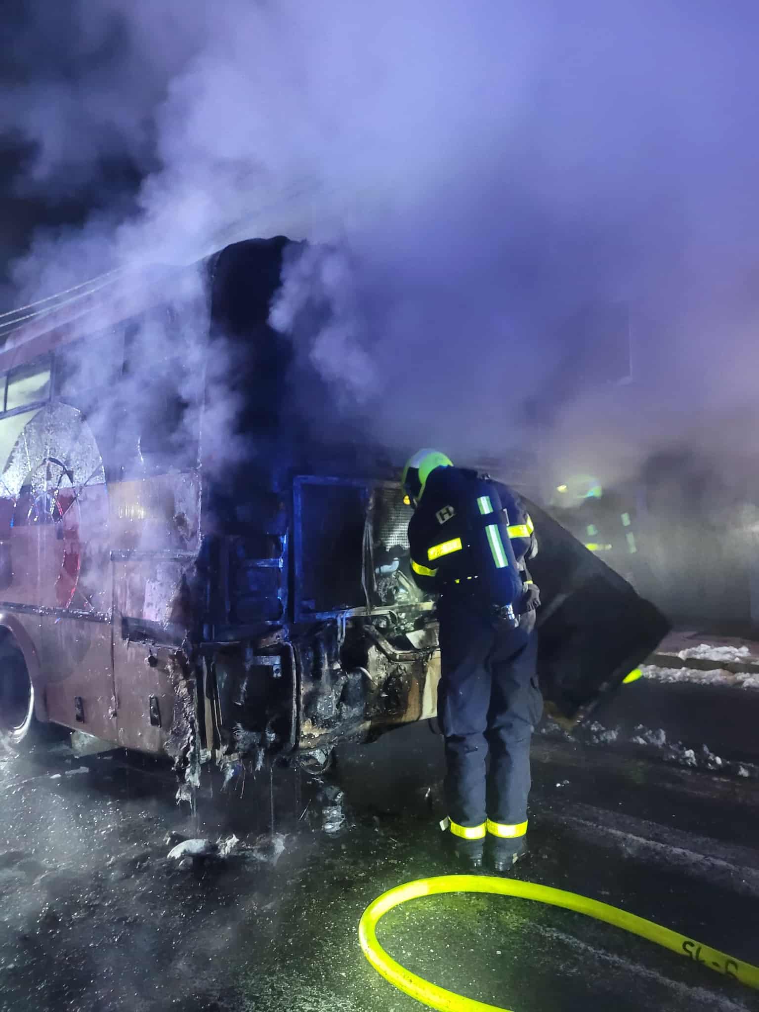 Požár autobusu ohrozil pět osob, plameny zasáhly kabinu i motorovou část