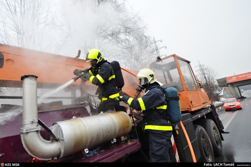 Dvě jednotky hasičů zasahovaly v pondělí 12.2.2018 odpoledne u požáru automobilového jeřábu na podvozku Tatra, který stál na okraji frekventované Rudné ulici u sjezdu do Ostravy-Radvanic. Díky rychlému zásahu mohla být předběžná škoda odhadnuta jen na 40 tisíc korun, požár se obešel bez zranění. Může za něj technická závada, která bude upřesňována vyšetřovateli požáru z HZS MSK.