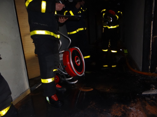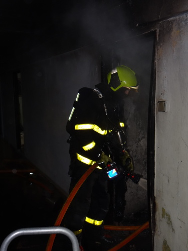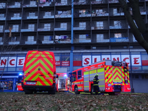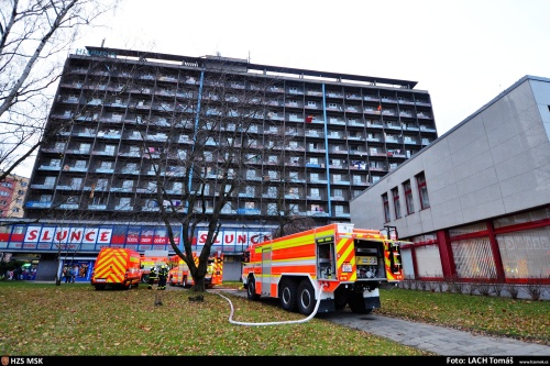 Hasiči rychle zjistili, že hoří v jednom bytě v osmém patře. Evakuovali celkem 24 osob z osmého a devátého patra, pro zraněného muže z hořícího bytu vystoupal koš automobilového žebříku AZ 55 MB Arocs.