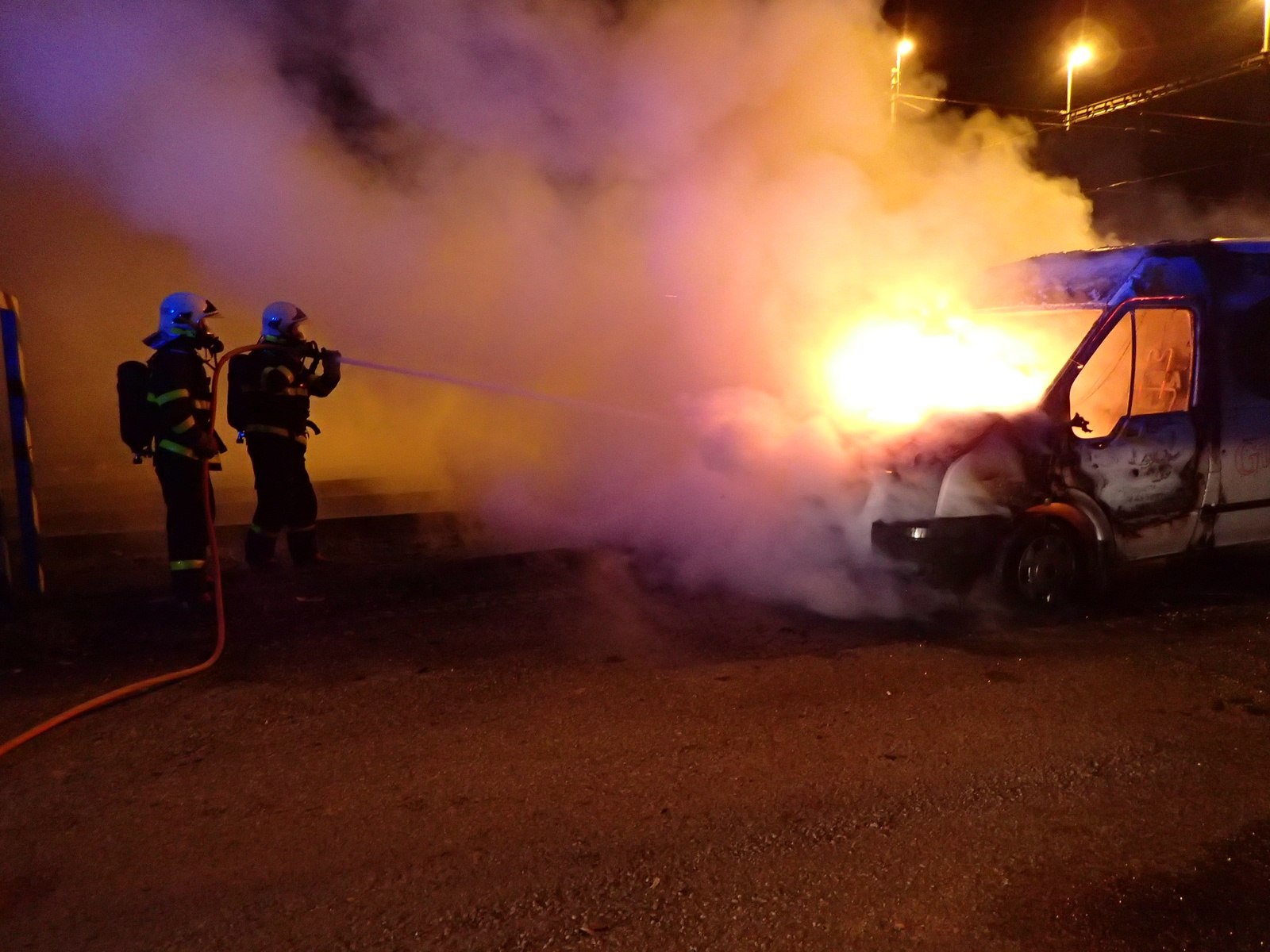 Po příjezdu na místo události byla přední část dodávky zasažena plameny. Hasiči požár lokalizovali vysokotlakým proudem za necelých pět minut, zcela uhašeno měli ve 4:00.