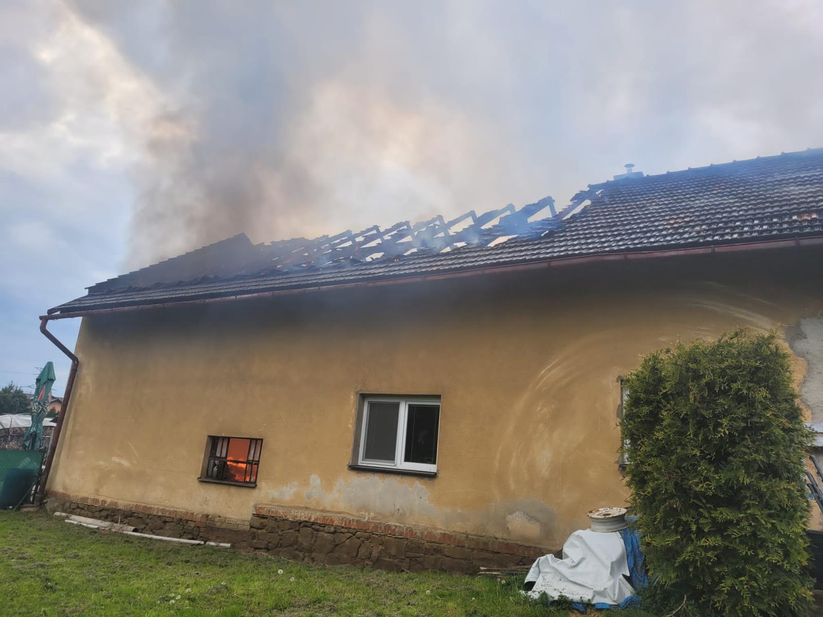 Již při příjezdu na místo události viděly jednotky hustý černý kouř a plameny šlehající ze střechy objektu. Hasiči začali okamžitě, pomocí čtyř vodních proudů, s likvidací požáru, přičemž jeden vodní proud byl použit při hašení střechy z výškové techniky. Po dobu likvidace požáru používali hasiči, pro svou ochranu, dýchací techniku, k vyhledávání skrytých ložisek požáru byla použita termokamera. Požárem byla zasažena nejen střecha garáže, ale i prostor pod ní, částečně došlo i k zasažení střešní konstrukce obytné části budovy, která navazovala na garáž.