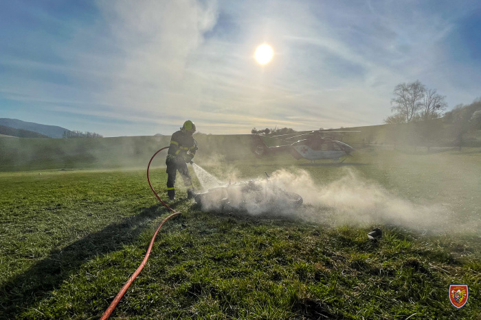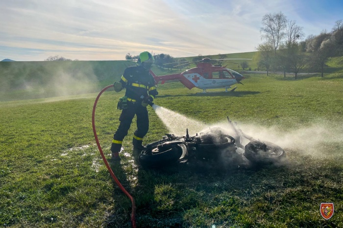 Profesionální hasiči z Frýdku-Místku zasahovali v úterý 12.4.2022 v podvečer u požáru motocyklu, který začal hořet po dopravní nehodě na okraji obce Hukvaldy, v místní části Dolní Sklenov (okres Frýdek-Místek). Motorkář byl při zásahu hasičů při vědomí.