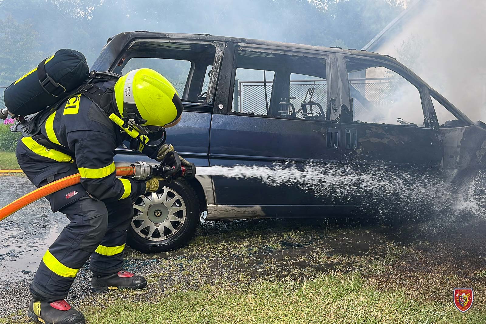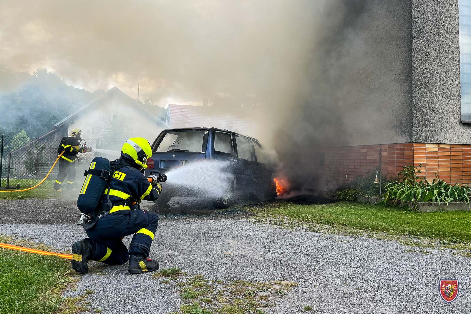 Automobil byl v době příjezdu první jednotky na místo události zcela zasažen požárem, plameny ohrožovaly i rodinný dům.