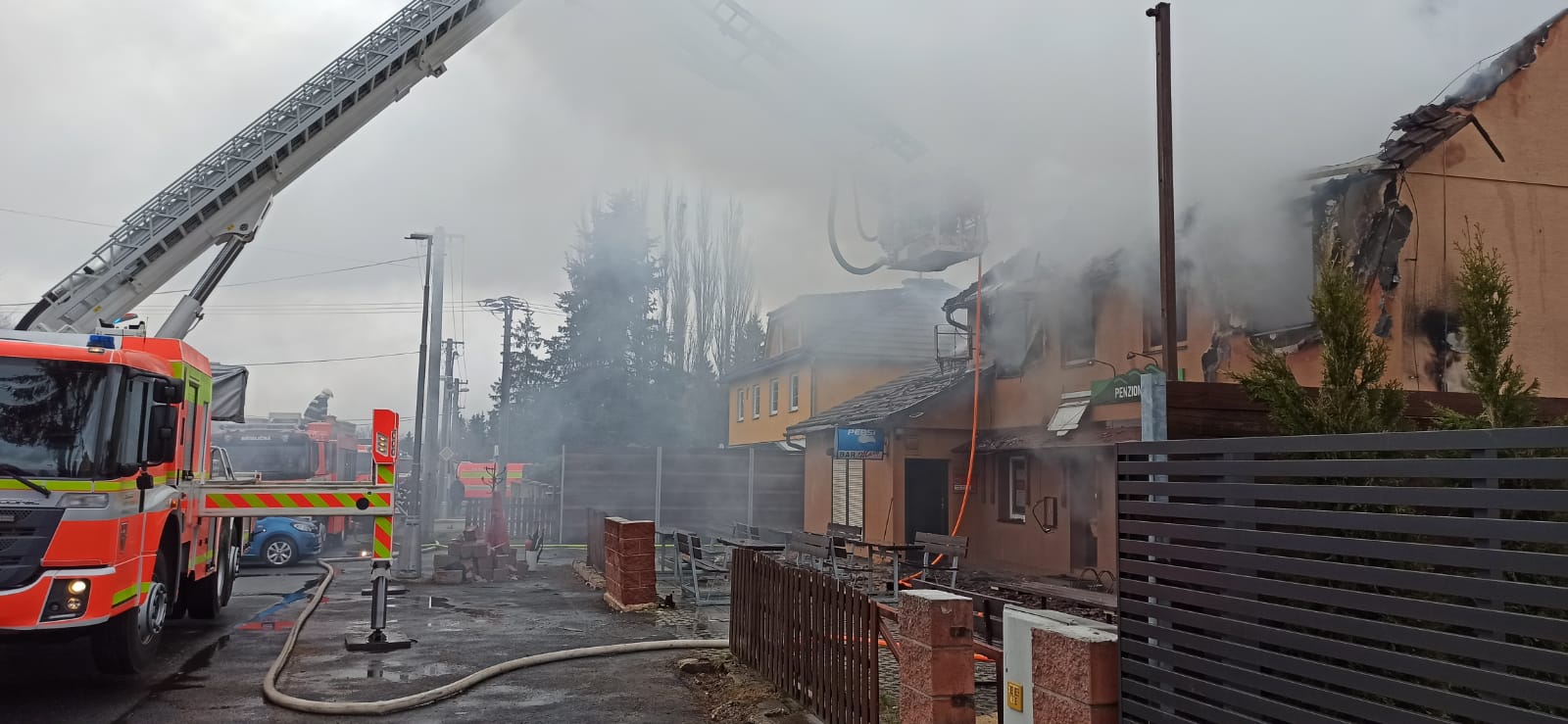 Už při příjezdu hasičů hořela celá budova z dřevěných trámů a dřevěných sendvičových stěn. Hasiči museli ze skladu vynést 5 tlakových lahví na dusík a propan butan, které ochlazovali v místním venkovním bazénku, další dvě tlakové lahve se roztrhly ještě uvnitř penzionu, ale nikoho nezranily.