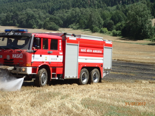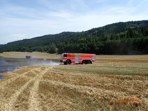 Operační středisko hasičů bylo o požáru na poli se sklízenou pšenicí informováno zhruba hodinu po pondělním poledni. Do Hošťálkov vyjela jednotka HZS Moravskoslezského kraje ze stanice Krnov, společně s ní dvě jednotky dobrovolných hasičů – Město Albrechtice a Krnov.