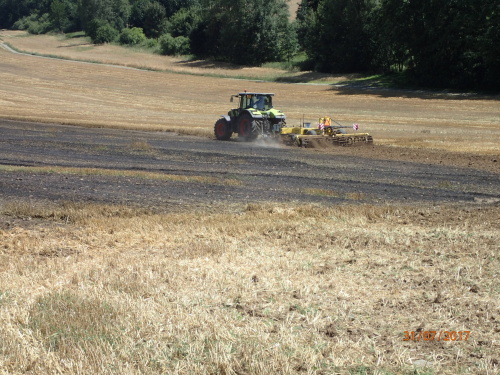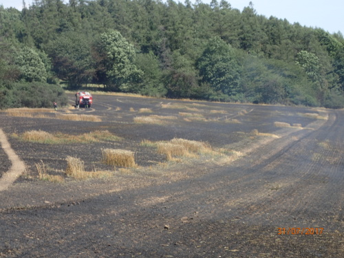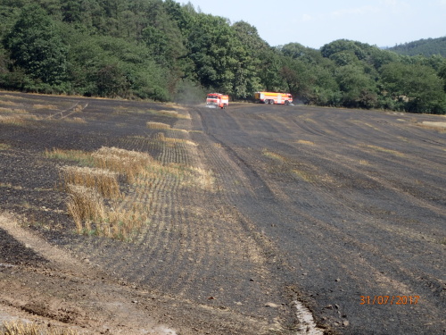 Tři jednotky hasičů zasahovaly v pondělí 31.7.2017 odpoledne u požáru pěti hektarů pole s obilím u obce Hošťálkovy (okres Bruntál). Hořet začalo od jisker, které způsobil nespecifikovaný předmět v žací liště kombajnu, zřejmě kámen. Požár s předběžně odhadovanou škodou 80 tisíc korun se obešel bez zranění.