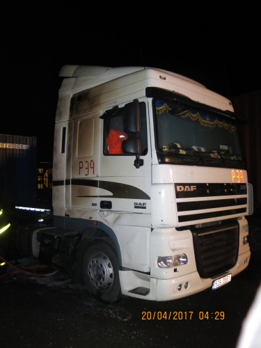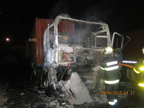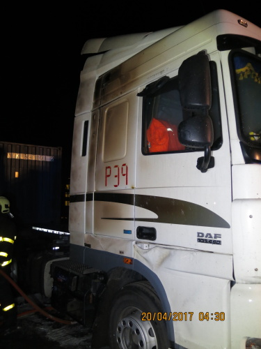 Při jejich příjezdu hořela kabina jednoho z tahačů, oheň poškodil i pravou stranu kabiny druhého tahače (DAF). Hasiči dostali oheň pod kontrolu během pěti minut, uhasili ho za čtvrt hodiny. První kabina byla požárem zcela zničena.