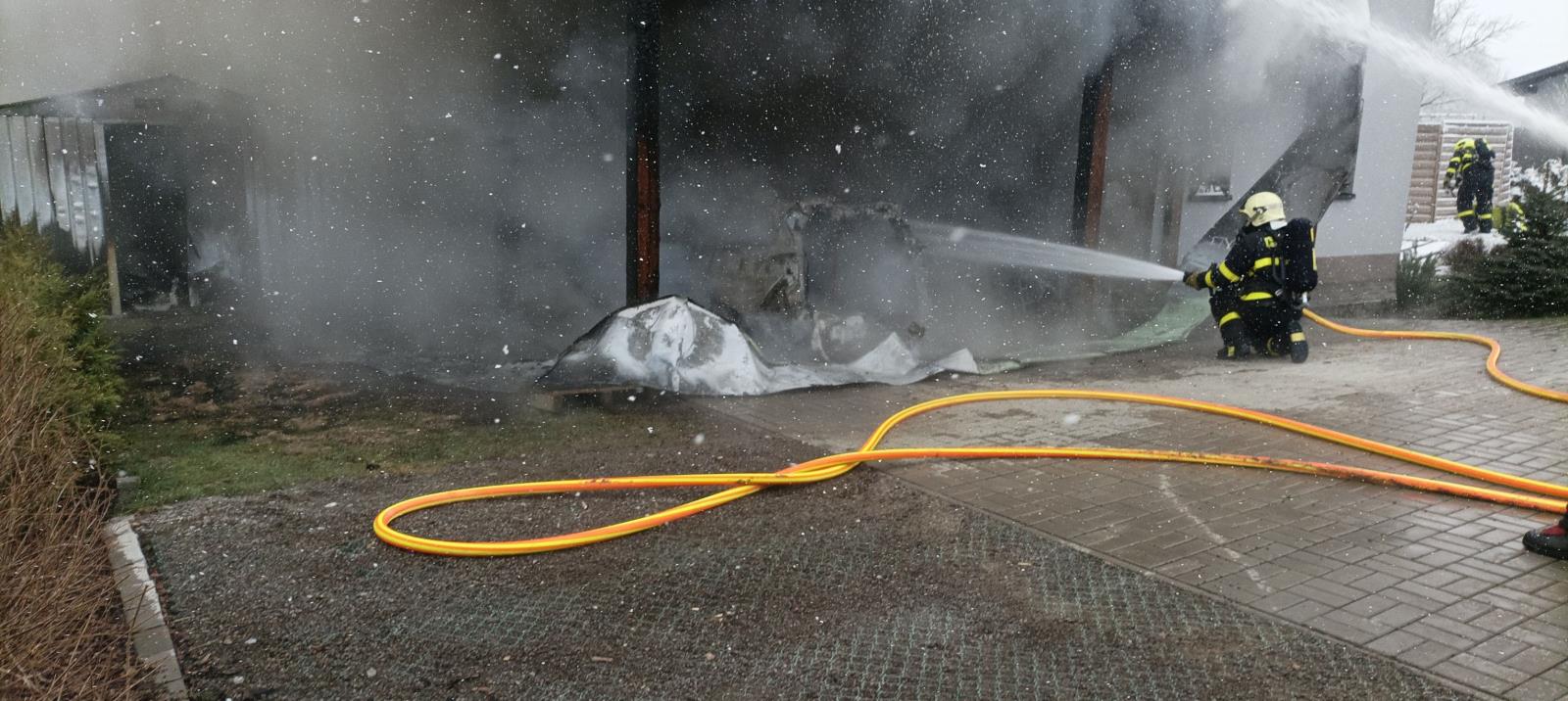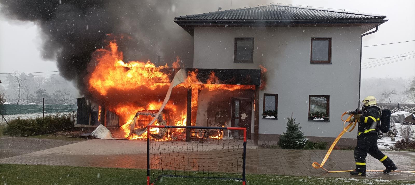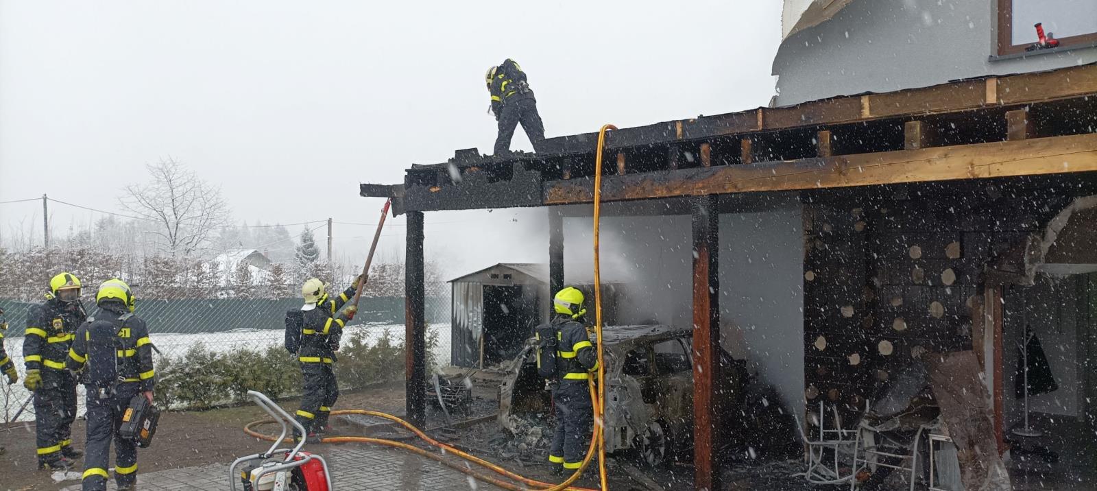 Jelikož se požár rozšířil z přístavku se zaparkovaným automobilem, který byl ohněm kompletně zničen, na vedlejší technickou plechovou místnost a dále se začal šířit i pod zateplení rodinného domu, nasadili hasiči k likvidaci plamenů tři vodní proudy. Vnitřkem budovy pak hlídali, aby se oheň nedostal do útrob rodinného domu.