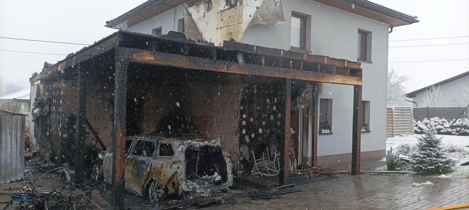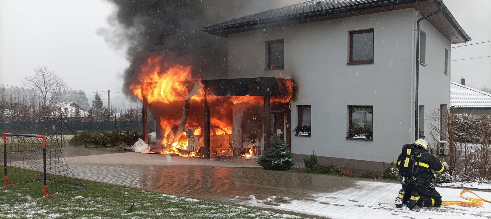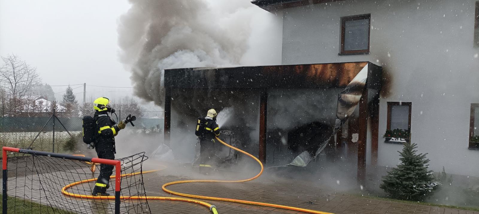 Jelikož se požár rozšířil z přístavku se zaparkovaným automobilem, který byl ohněm kompletně zničen, na vedlejší technickou plechovou místnost a dále se začal šířit i pod zateplení rodinného domu, nasadili hasiči k likvidaci plamenů tři vodní proudy. Vnitřkem budovy pak hlídali, aby se oheň nedostal do útrob rodinného domu.
