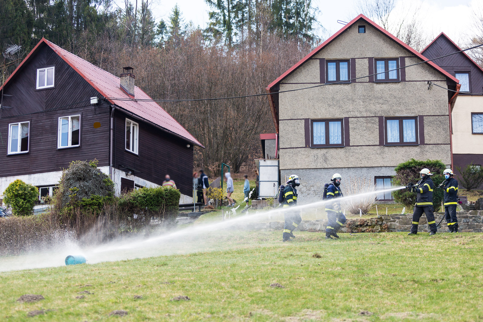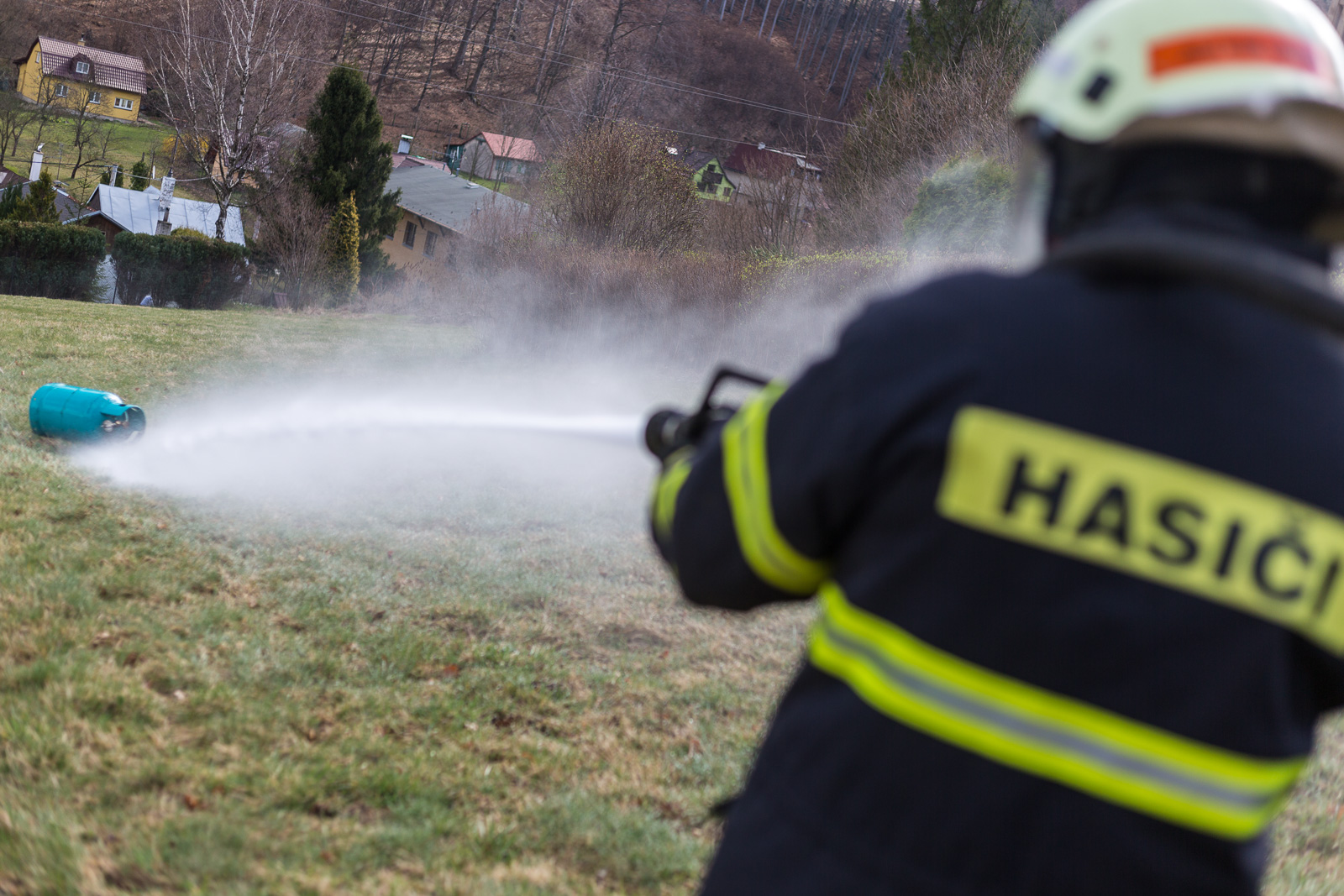 Hasiči po příjezdu na místo události v dýchací technice vynesli tlakovou láhev mimo objekt na louku, kde ji začali okamžitě ochlazovat vodou z cisternové automobilové stříkačky.