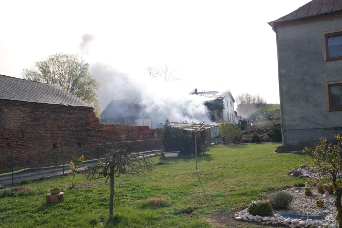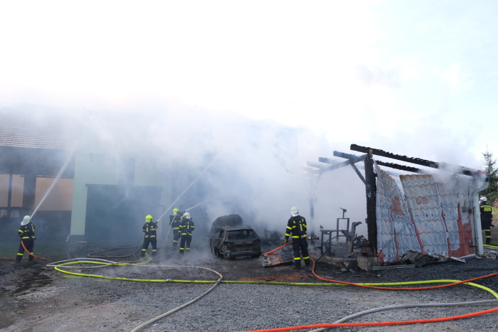 Od přilehlé garáže se zaparkovanými vozidly a stroji začala hořet ještě před příjezdem hasičů fasáda rodinného domku, od ní se požár stačil rozšířit na část rodinného domku a jeho střechu. Hasiči dostali oheň pod kontrolu za necelé tři hodiny, dohasili ho s rozebíráním konstrukcí za další dvě hodiny.