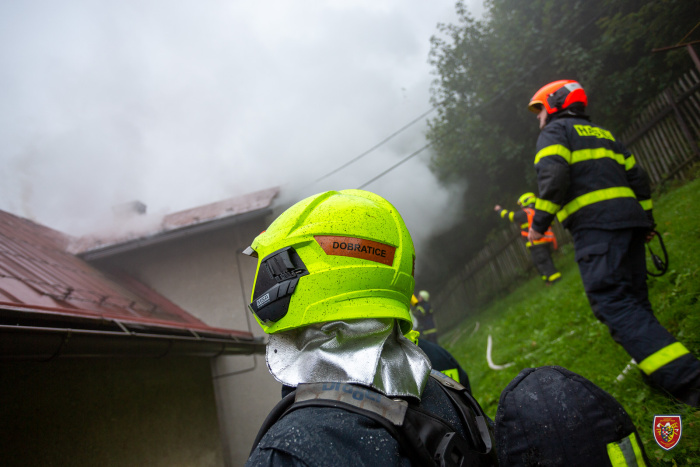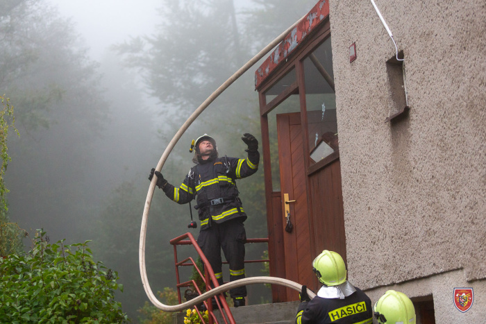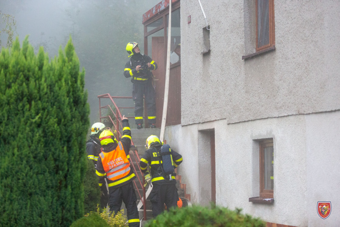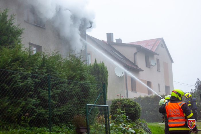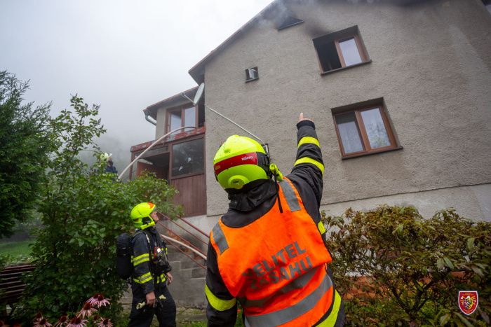 Požár rodinného domku v Komorní Lhotce se zraněním
