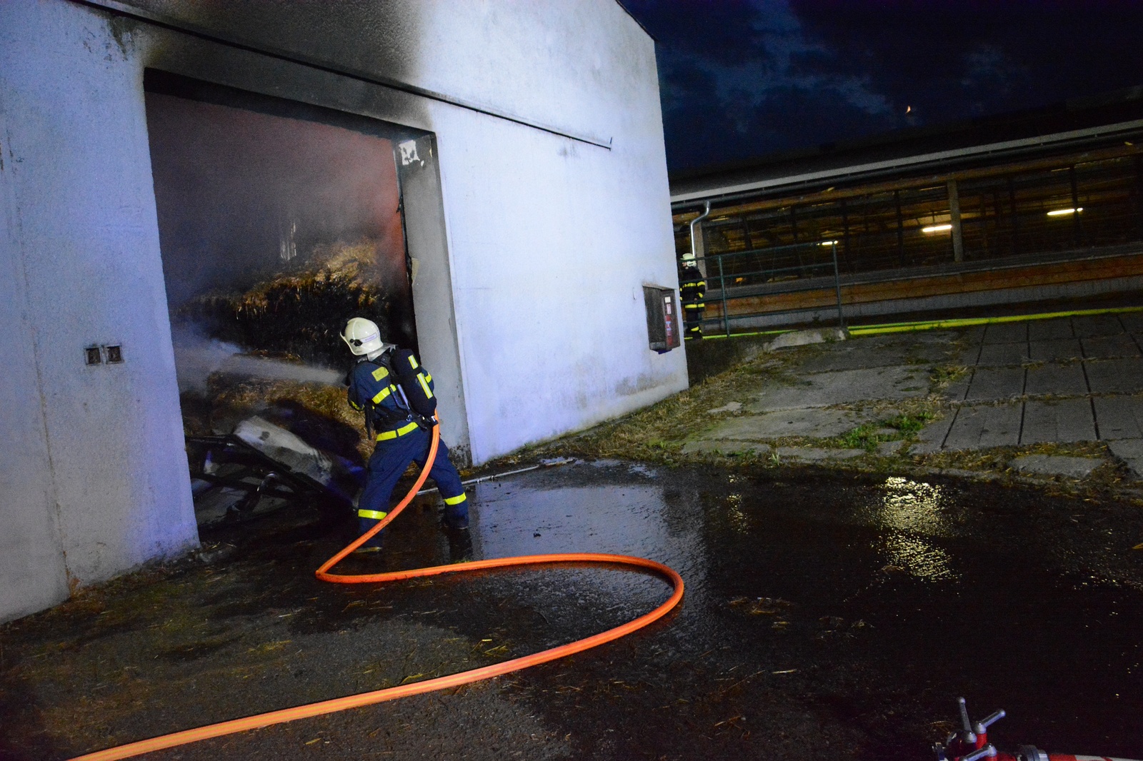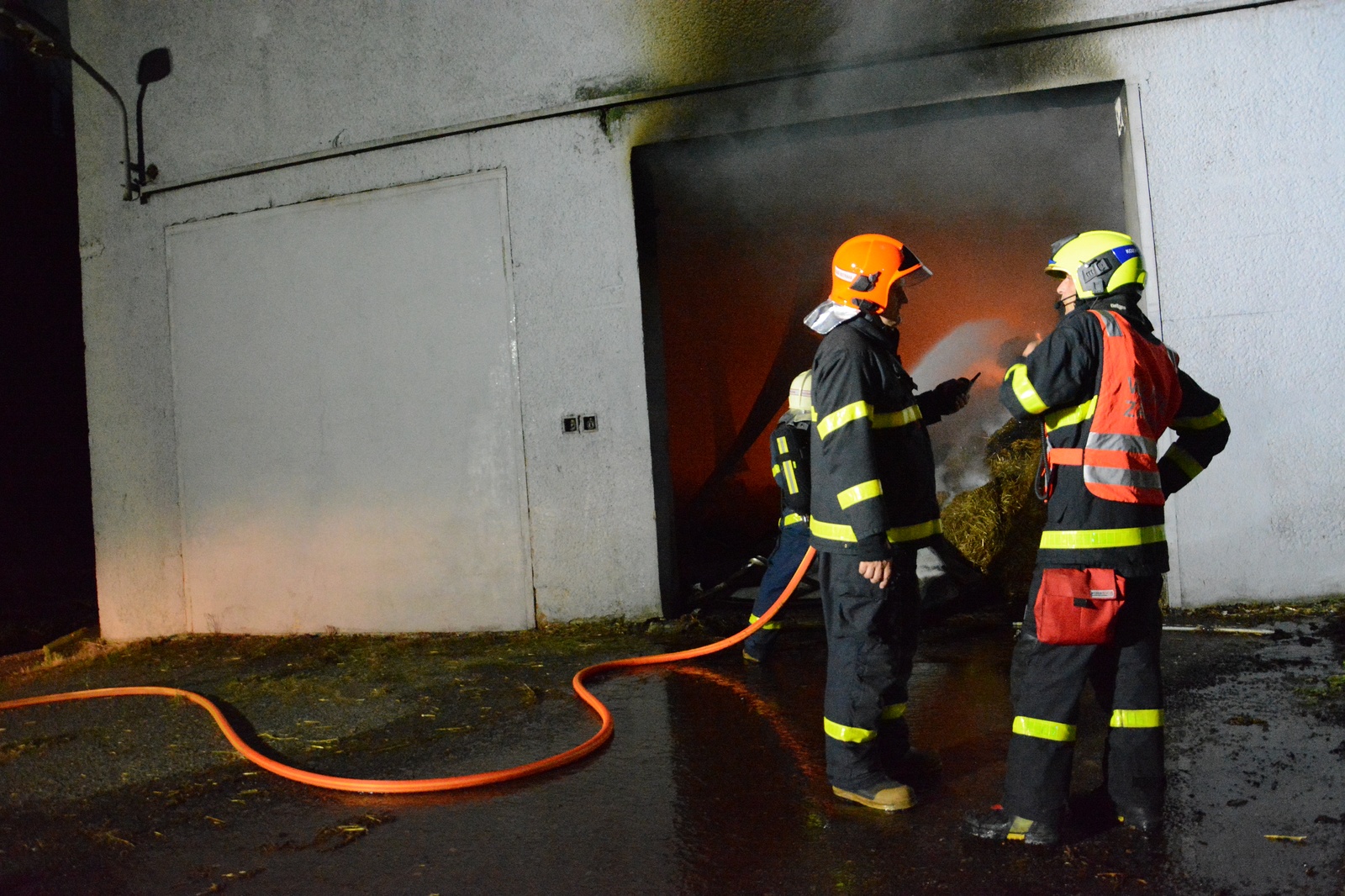 Požár se podařilo lokalizovat pět minut před půlnocí, zlikvidován v tuto chvíli ještě stále není. Na místě zůstalo pět hasičských jednotek, které dohašují především vyvezenou slámu.