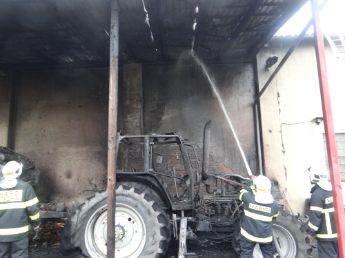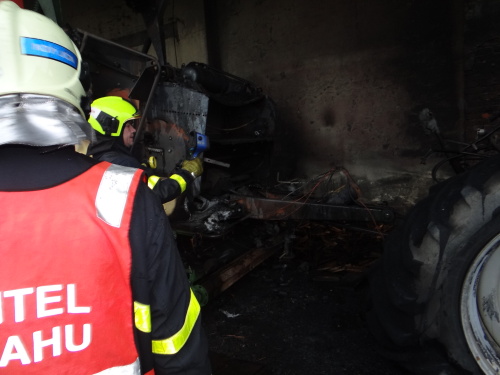 Při příjezdu hasičů už vydatně hořel traktor i lis, stojící za sebou v zastřešeném přístavku u zdi kravína. Ta začala hořet i s hliníkovou střechou kravína, v němž byli ustájeni býci a kde ležela mimo kotce suchá sláma.