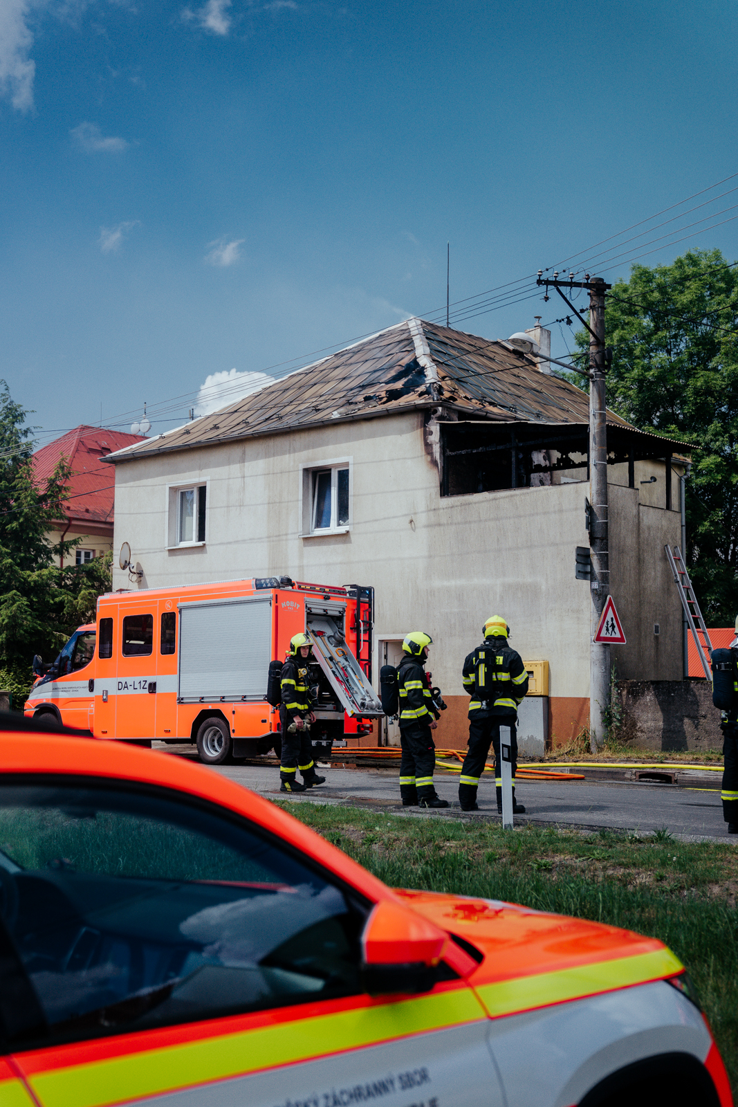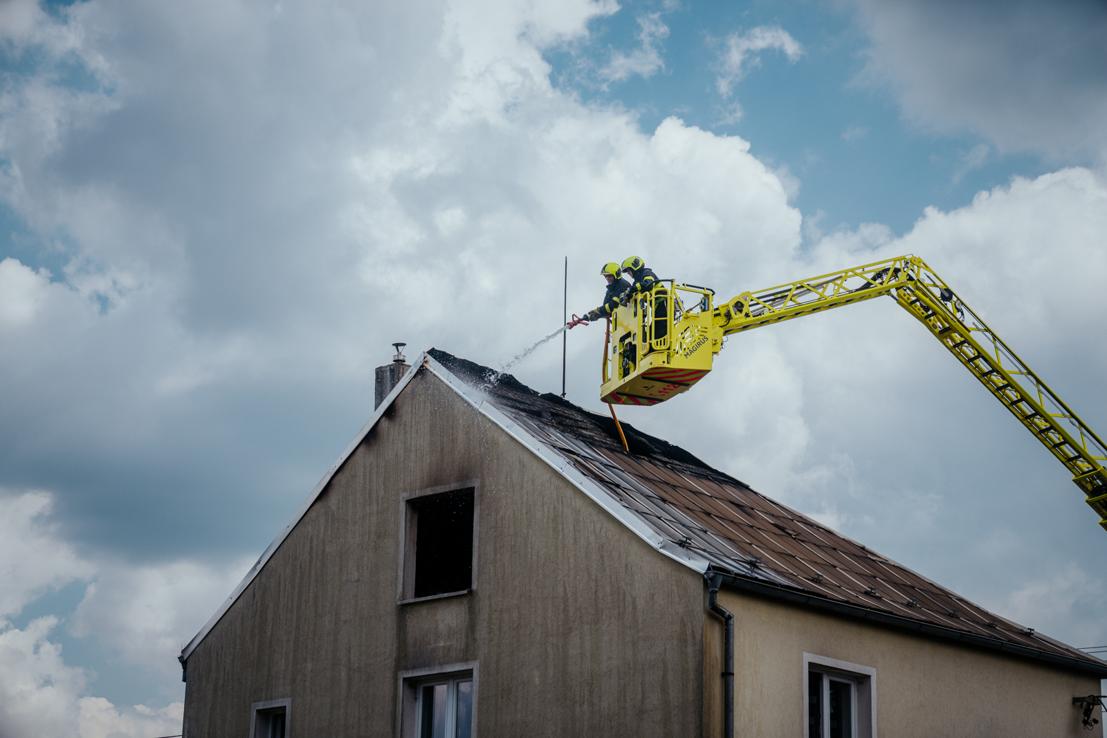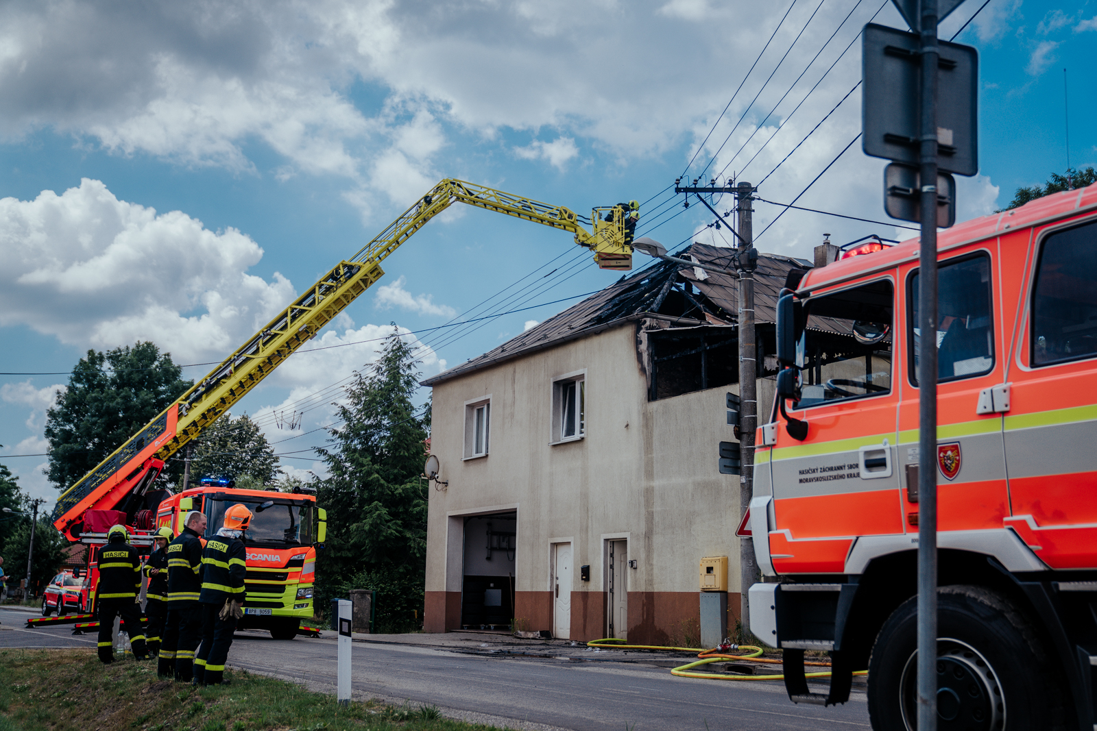 Požár dostali hasiči pod kontrolu za necelou půlhodinu, z automobilového žebříku následně rozebírali střešní konstrukci.