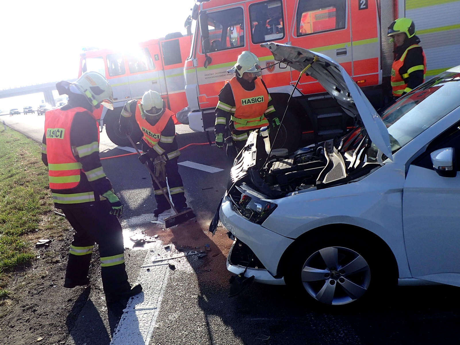 Hasiči na místě provedli protipožární opatření na havarovaných automobilech a zasypali sorbentem provozní kapaliny uniklé na komunikaci.
