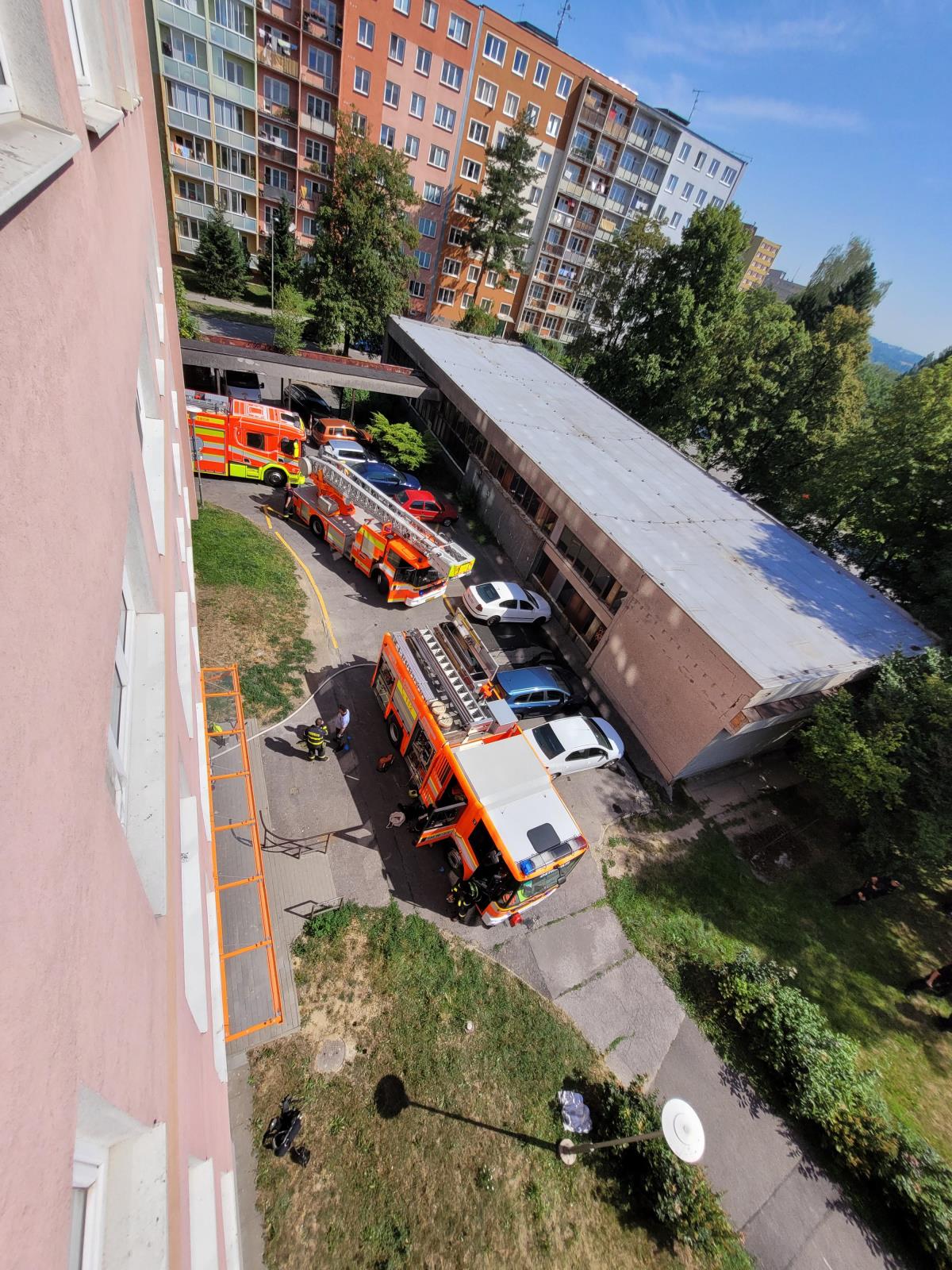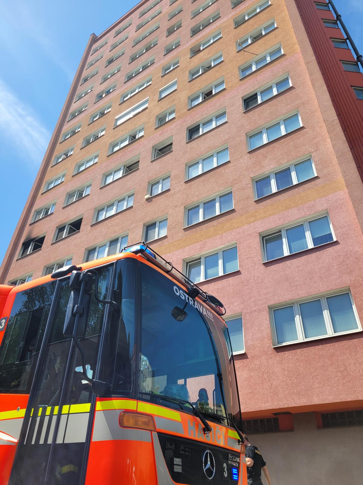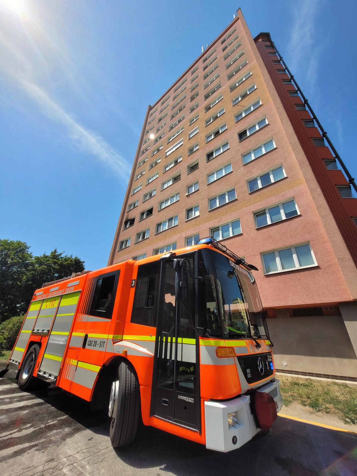 Tři jednotky hasičů likvidovaly ve čtvrtek 21. července 2022 dopoledne požár bytu ve výškovém objektu v ostravské části Poruba.