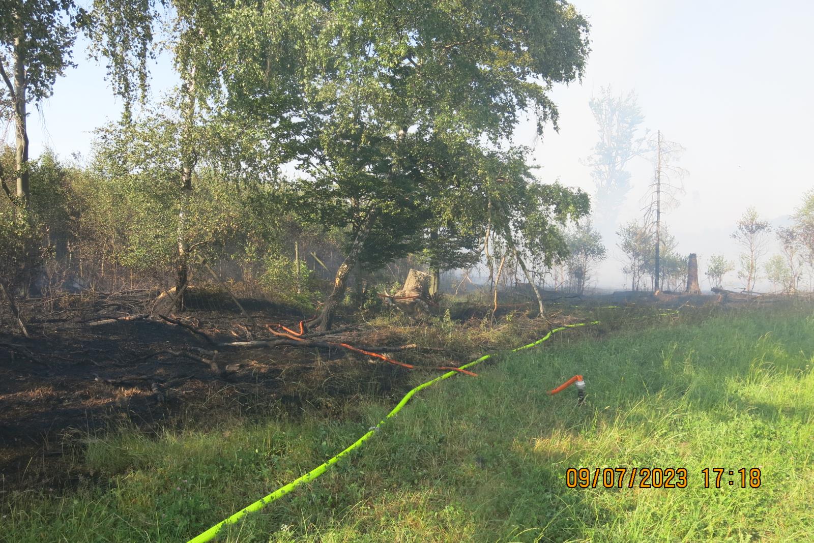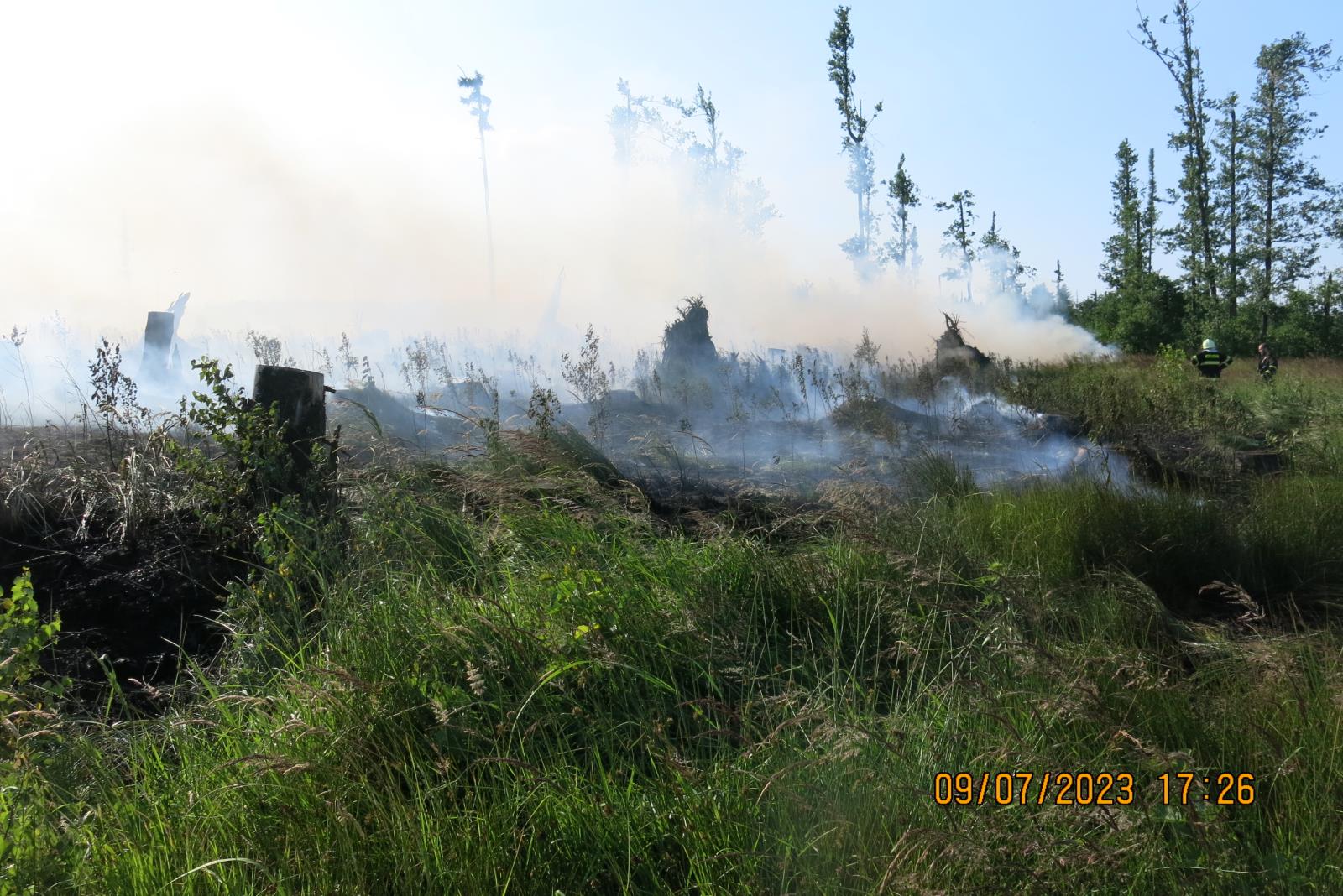 Již při příjezdu k místu události viděli hasiči hustý tmavý kouř, který z lesa vycházel a který po celou dobu komplikoval zásah. Z důvodu hustého kouře tak hasiči museli, až do doby, kdy se jim oheň podařilo dostat pod kontrolu, zasahovat v dýchací technice. Pro boj s ohněm nasadili hasiči celkem sedm vodních proudů, které zásobovali cisternami z čerpacího stanoviště zřízeného u přehrady Slezská Harta.
