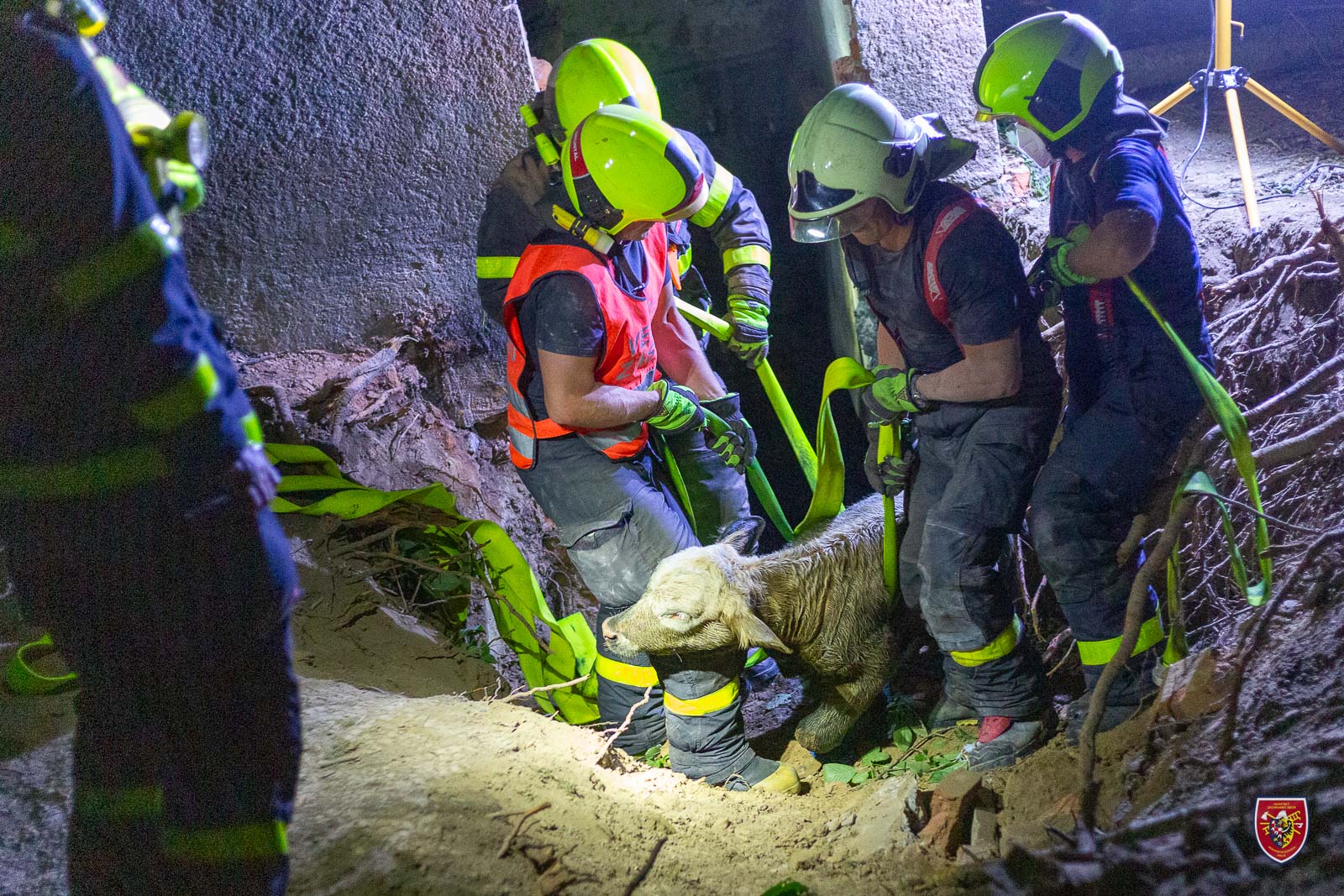 Tři hasičské jednotky se v pondělí večer zapojily do náročné a dlouhotrvající záchrany krávy a telete z přibližně dva metry hluboké jímky ve Starých Heřminovech na Bruntálsku.