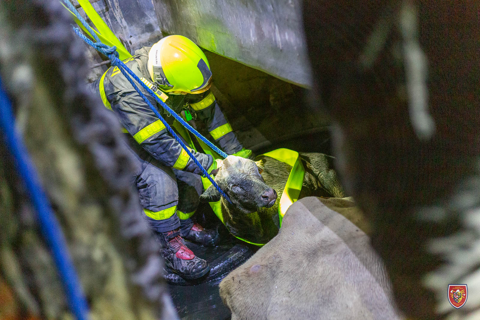 Událost byla na tísňovou linku ohlášena tři minuty po dvacáté hodině, zvířata se podle oznamovatele propadla do jímky v budově bývalé napáječky.