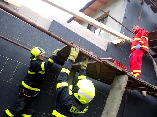Obě složky k zásahu dorazily společně. Hasiči stabilizovali lešení, zpevnili ho provizorním pažením a rozšířili v prvním patře lešení plošinu s postiženým mužem pro snadnější práci zdravotníků, a to dvěma dřevěnými podlážkami.