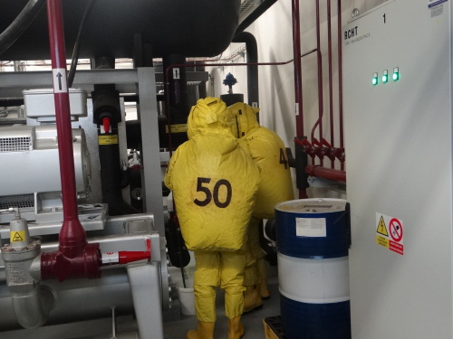 Druhá skupina hasičů - v ochranném protichemickém obleku (OPCH) - provizorně utěsnila místo kolem vadného těsnění. Mezitím hasiči postavili venku deflektory, mj. kvůli vytváření vodní clony pro zabránění vytvoření toxického mraku amoniaku.