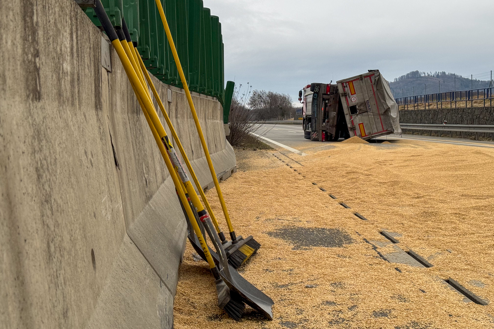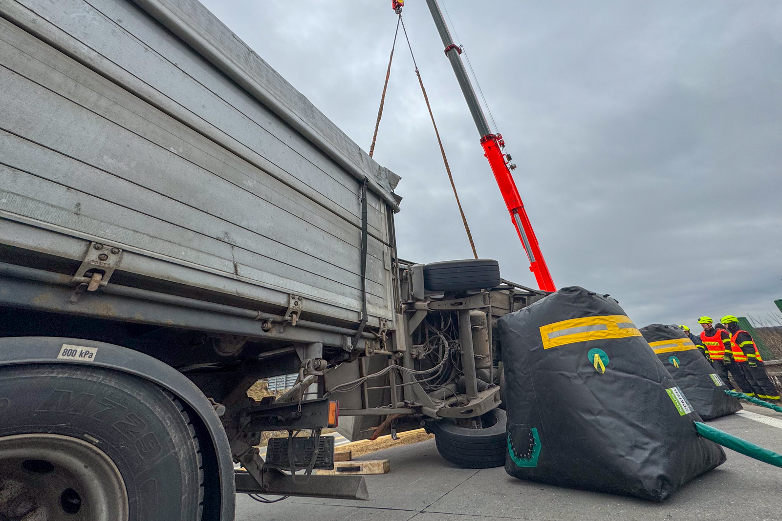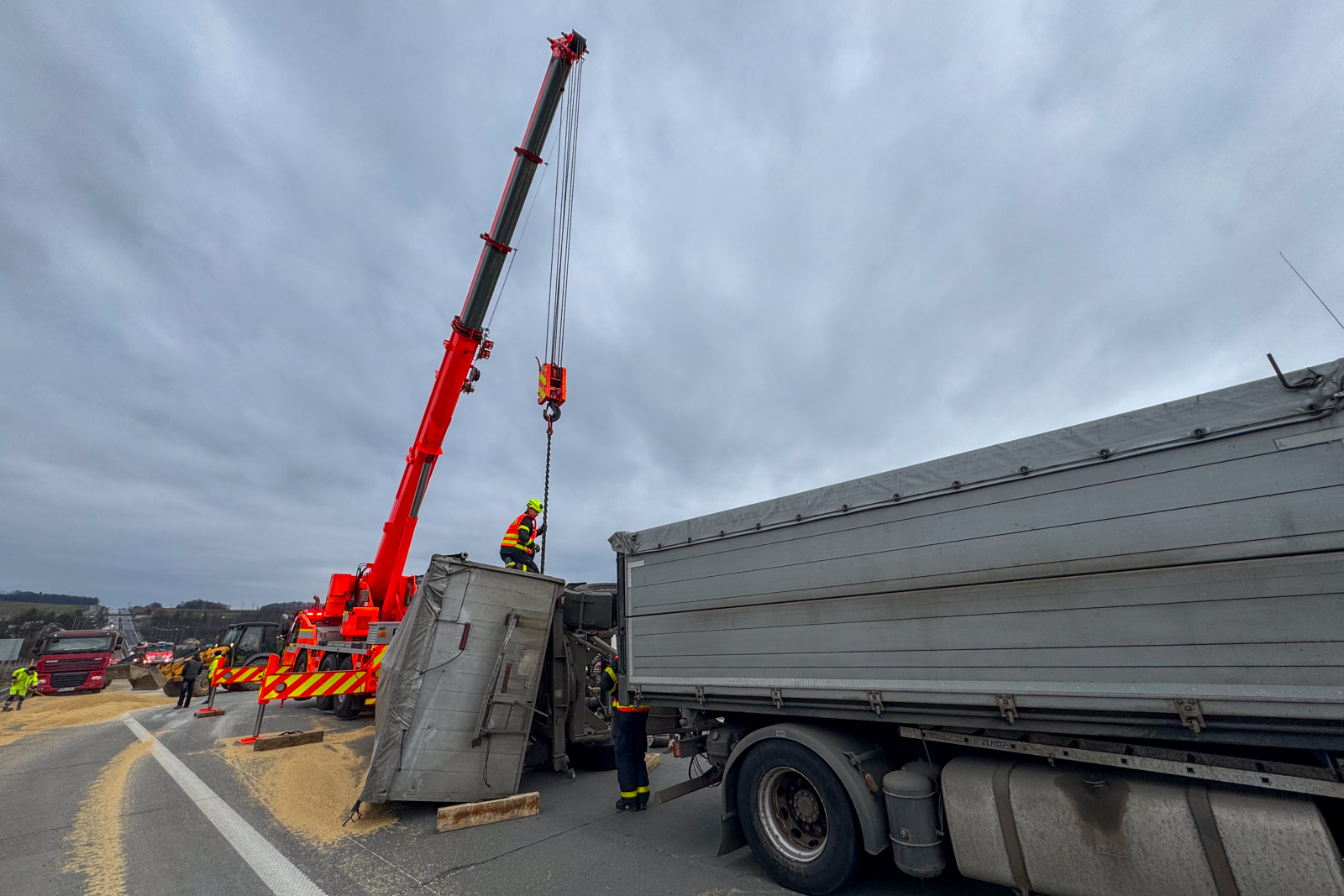 U převráceného vleku naloženého obilím zasahovali v pondělních ranních hodinách hasiči. Dálnice byla při vyprošťování vleku uzavřena na několik hodin. Na místo nehody vyrazila i těžká vyprošťovací technika.