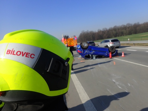 Dvě jednotky hasičů zasahovaly v sobotu 7.4.2018 ráno u nehody osobního automobilu Peugeot 206 na dálnici D1 u Bílova (okres Nový Jičín). Hasiči nejprve uzavřeli dálnici ve směru na Brno, poskytli 4 lehce zraněným předlékařskou pomoc, zalepili proraženou palivovou nádrž tmelem a otočili vlastníma rukama peugeot ze střechy na kola.