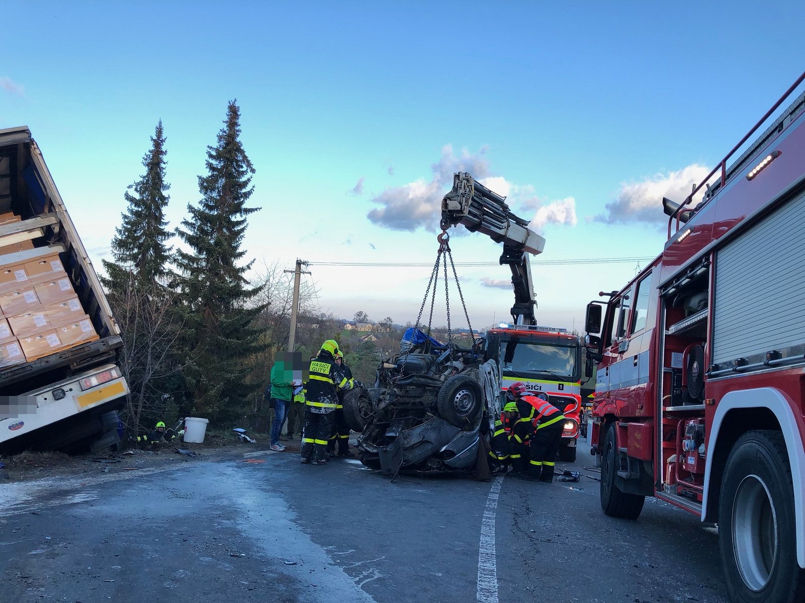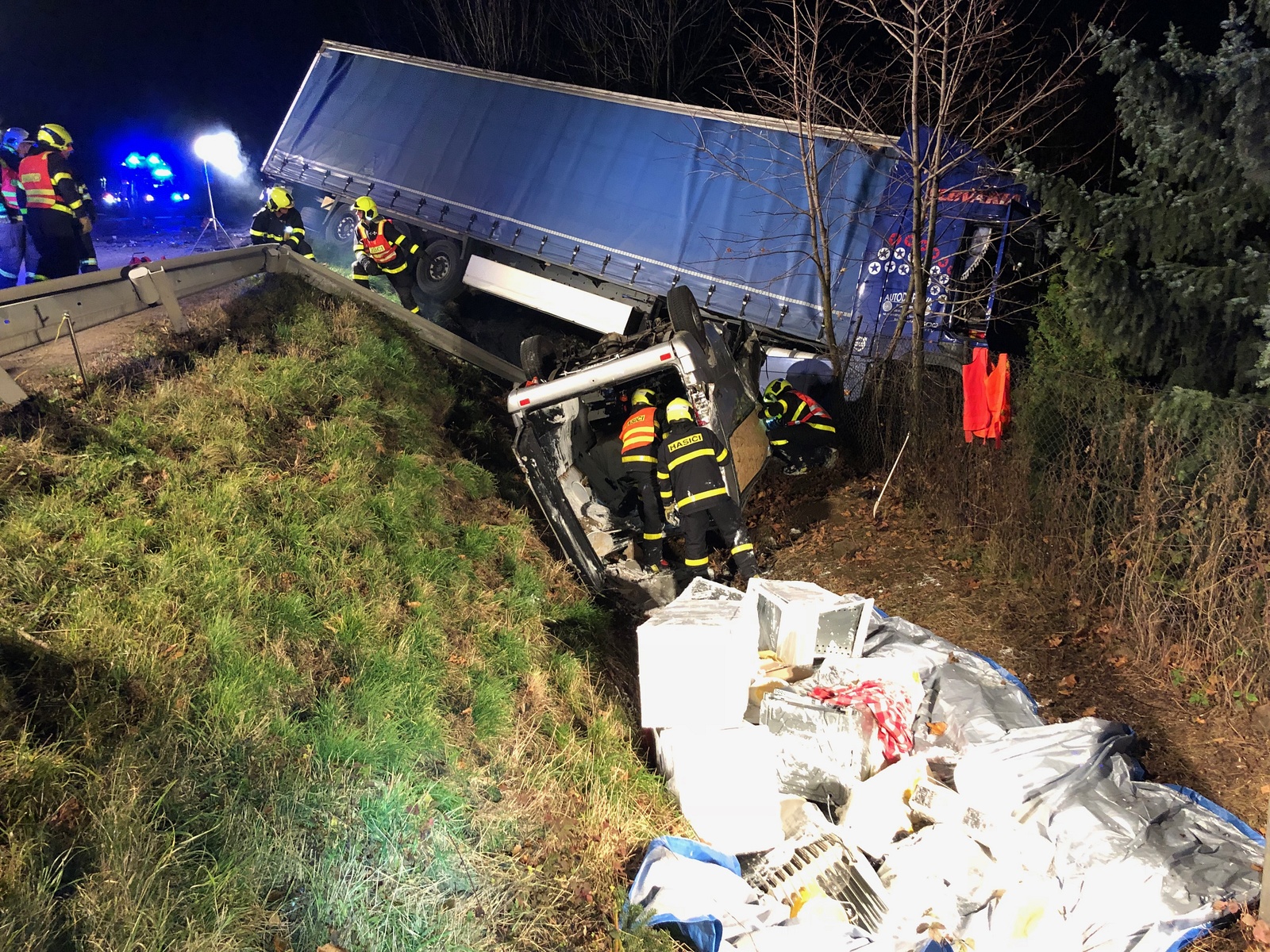 Hasiči po příjezdu k dopravní nehodě zjistili, že došlo ke střetu kamionu a dodávky. Oba automobily skončily mimo komunikaci, dodávka se navíc převrátila na střechu. Uvnitř a také částečně pod ní zůstalo zaklíněno celkem pět osob.
