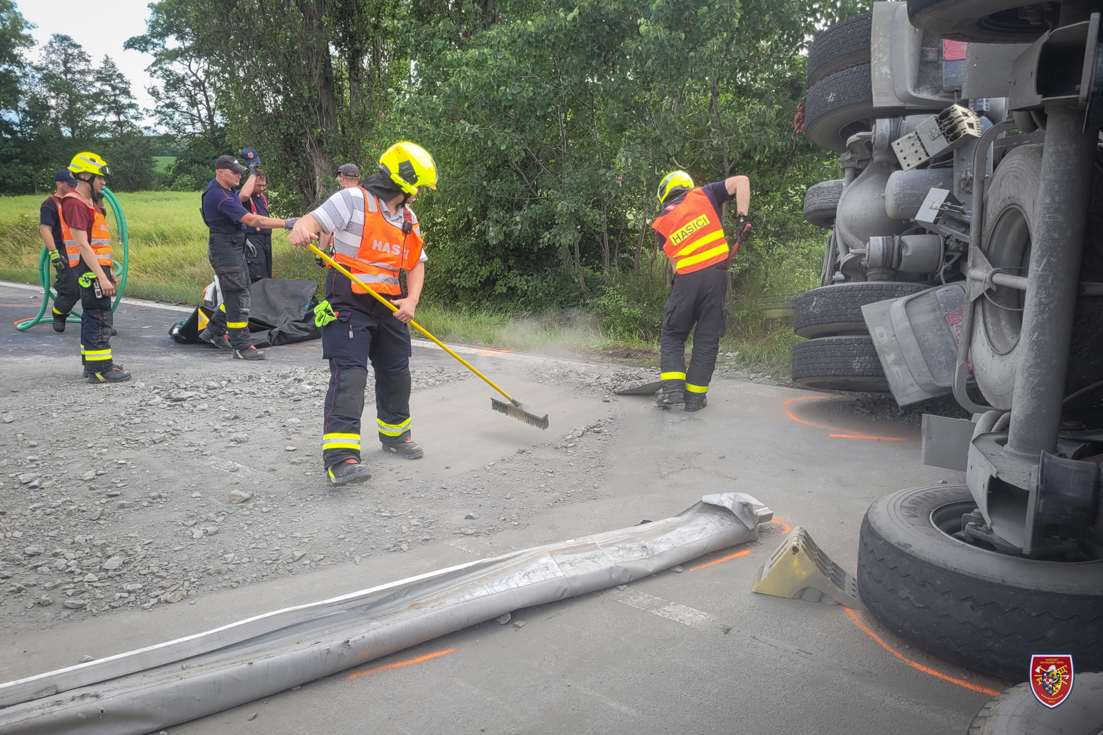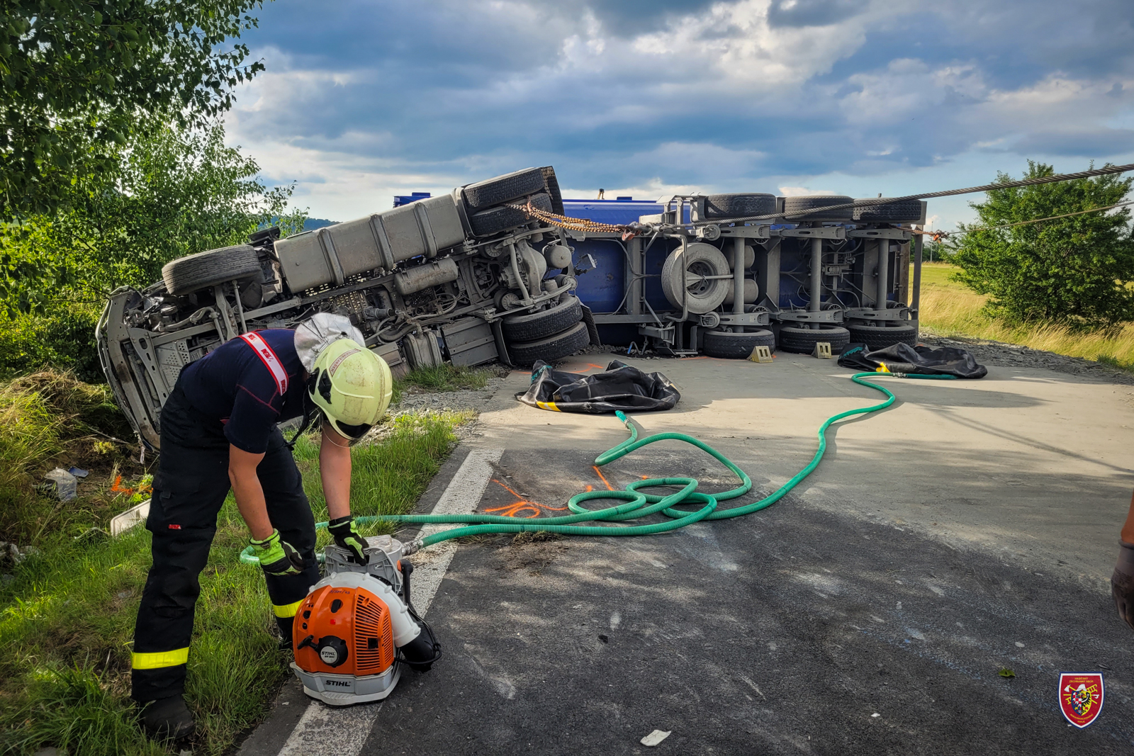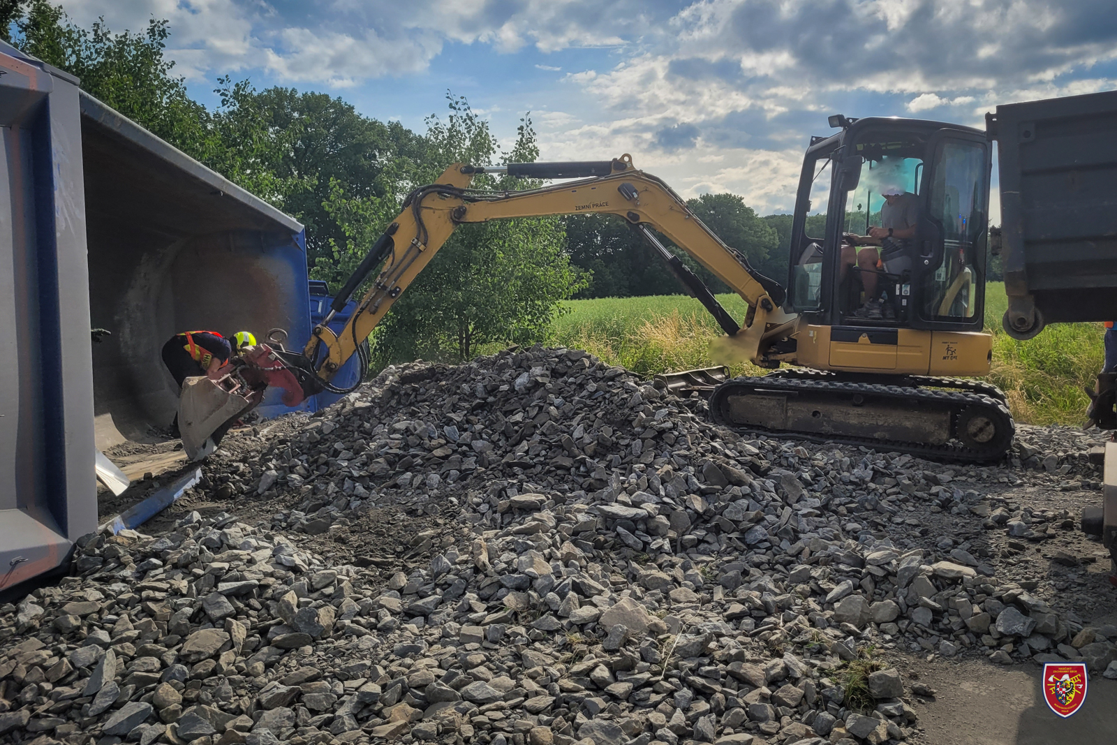 Náklad drceného kamene se při nehodě vysypal na komunikaci, nákladní automobil zůstal převrácený na boku. S vyložením zbytku nákladu z návěsu pomohl hasičům bagr soukromého majitele z nedaleké stavby.