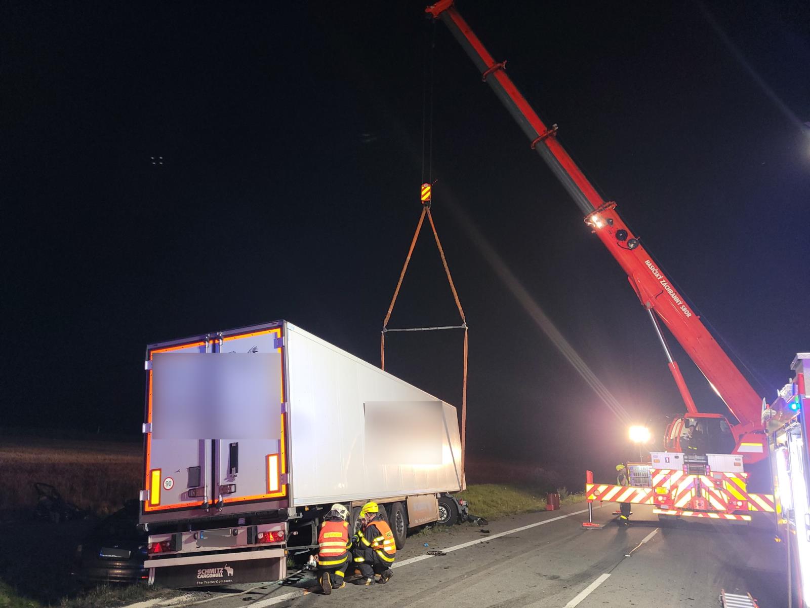 Po příjezdu hasiči zjistili, že došlo k nehodě kamionu a osobního vozidla, ve kterém zůstala zaklíněna osoba, která měla velmi vážná zranění. Hasiči ihned zahájili vyprošťovaní pomocí hydraulického nářadí. Během několika minut však bylo vyprošťování přerušeno, neboť lékař u zraněné osoby konstatoval smrt následkem utrpěných zranění. Hasiči se současně s vyprošťováním zaměřili i na zajištění obou vozidel proti požáru.