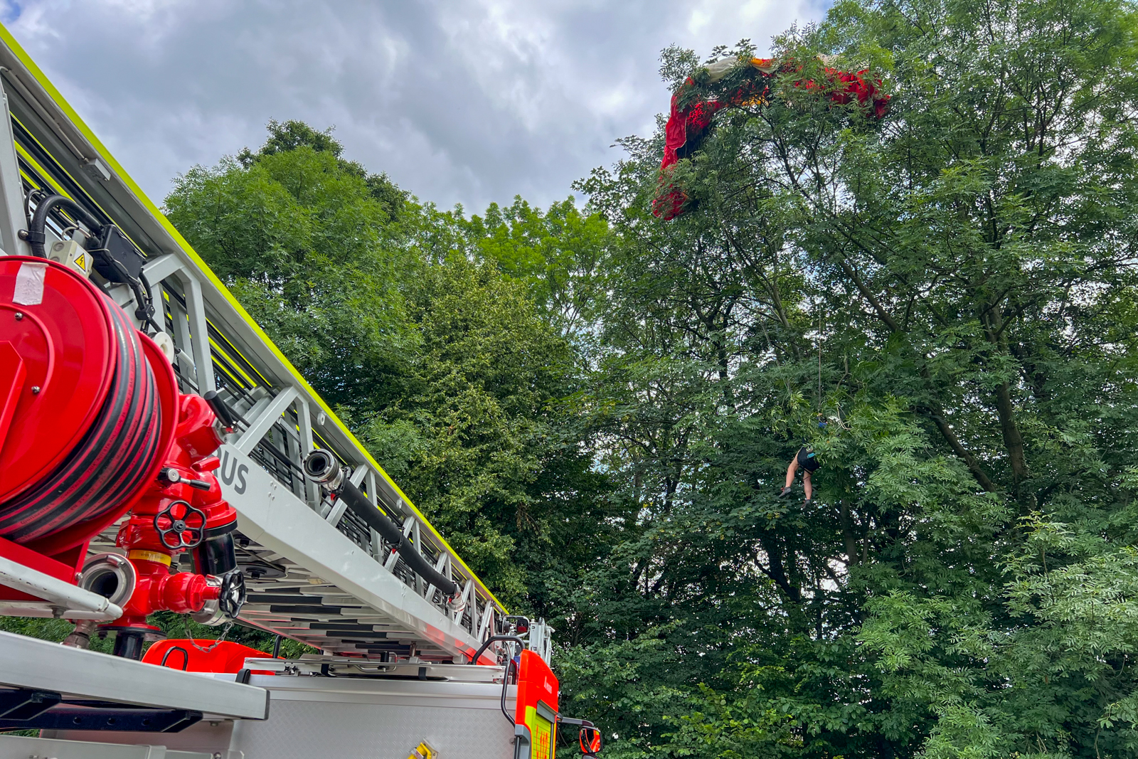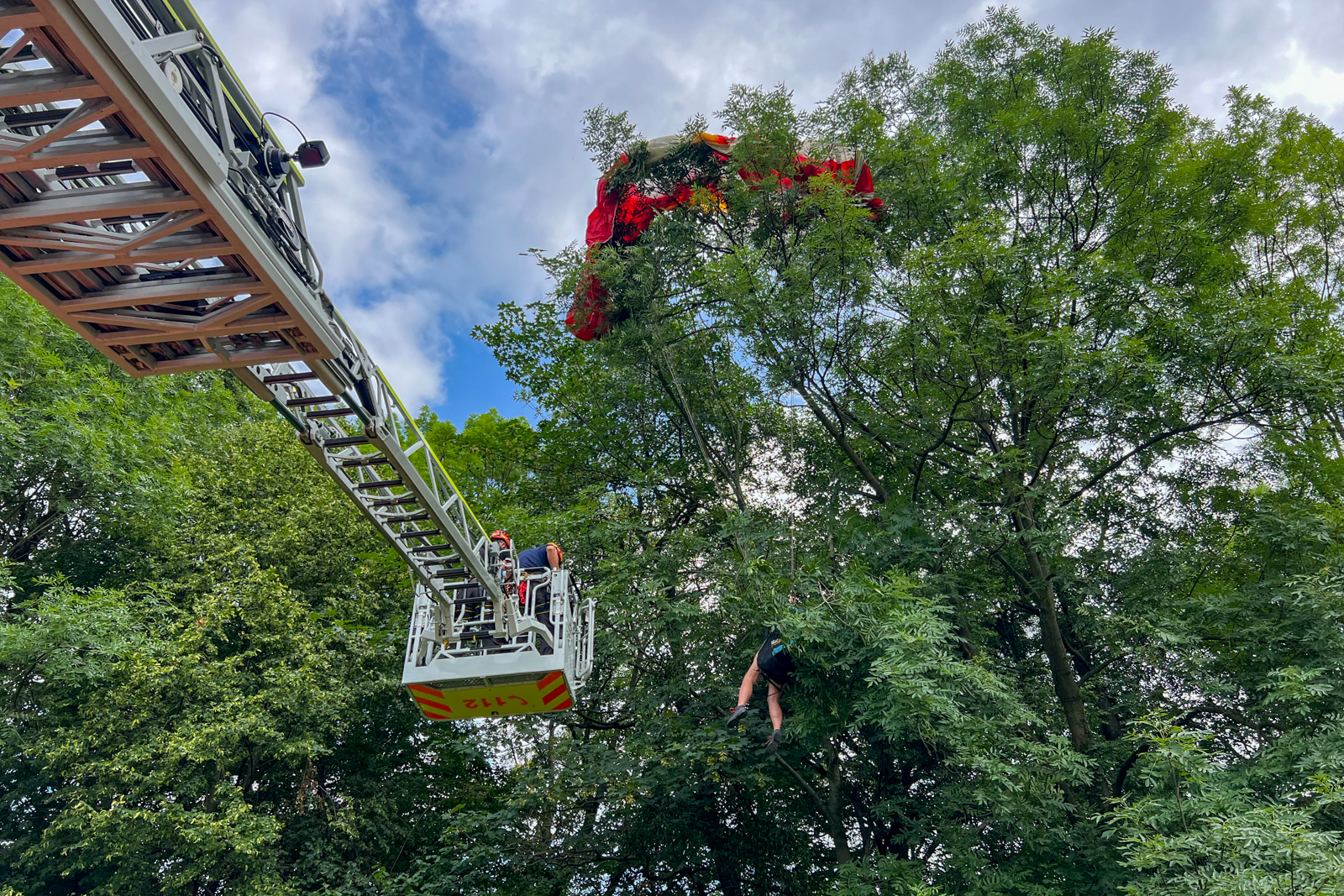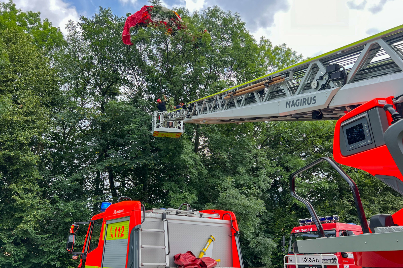 Hasiči k záchraně využili automobilový žebřík, pomocí nějž postupně sundali jak nezraněnou paraglidistku, tak následně její nepoškozené křídlo.