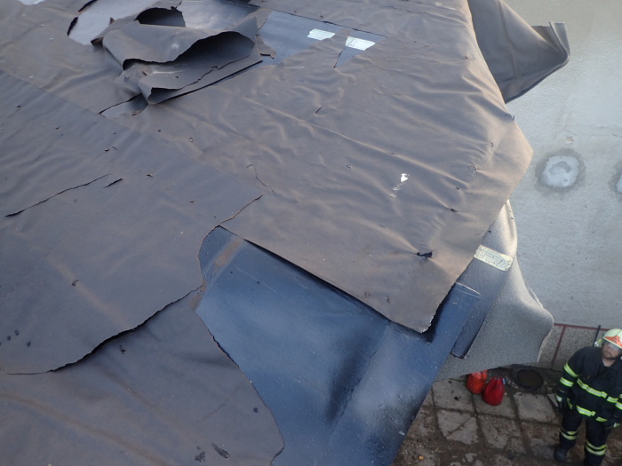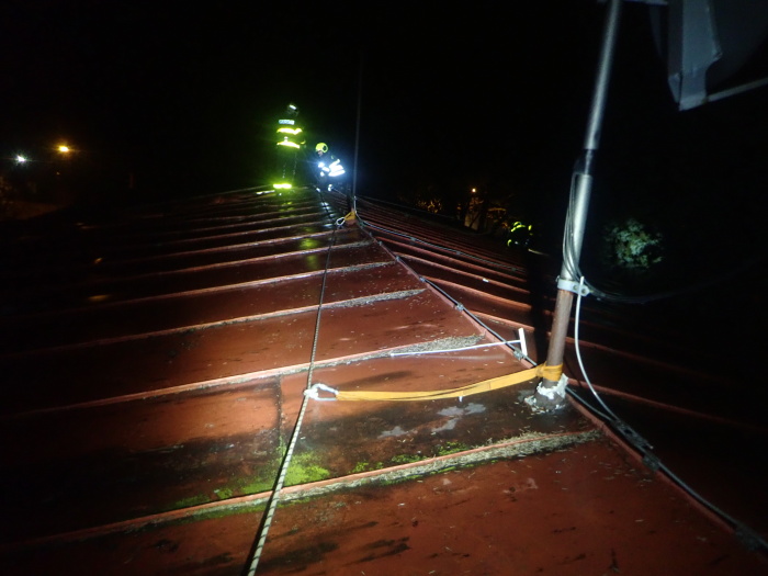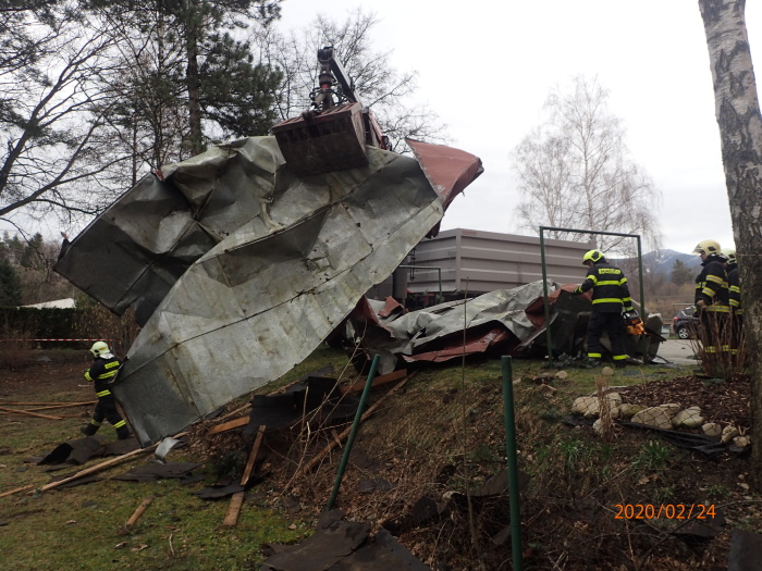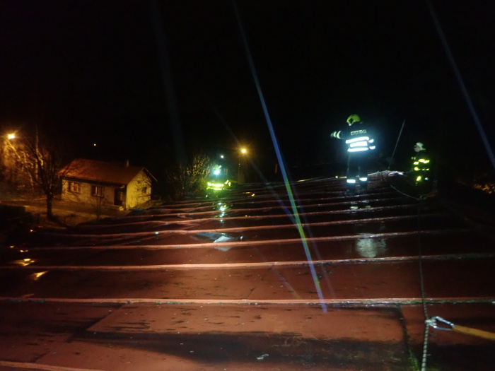 V nedělních večerních hodinách obě jednotky provizorně uchytily zbylou střešní konstrukci, aby nedošlo k dalšímu utržení. Část plechů, které vítr utrhl ze střechy, již poničilo několik osobních vozů na blízkém parkovišti, taktéž oplocení pozemku. Tyto velké kusy plechů byly v noci přikurtovány, aby je popřípadě následně opět neodnesl vítr a nezpůsobily další škodu nebo zranění.