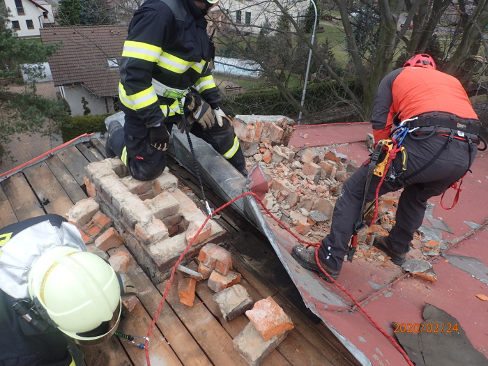V pondělních ranních hodinách byly opět obě zmíněné jednotky povolány k dalším činnostem - odstranění vyvráceného tříprůduchového komína ze střechy a k rozřezávání plechů. Majitel objektu si domluvil svou pokrývačskou firmu, také nákladní automobil s kontejnerem, na který byly plechy naloženy i za pomoci hasičů. Pozemek byl opáskován kvůli nebezpečným deskám s hřebíky. Hasiči stáhli ocelové lano z hromosvodu ze stromu.