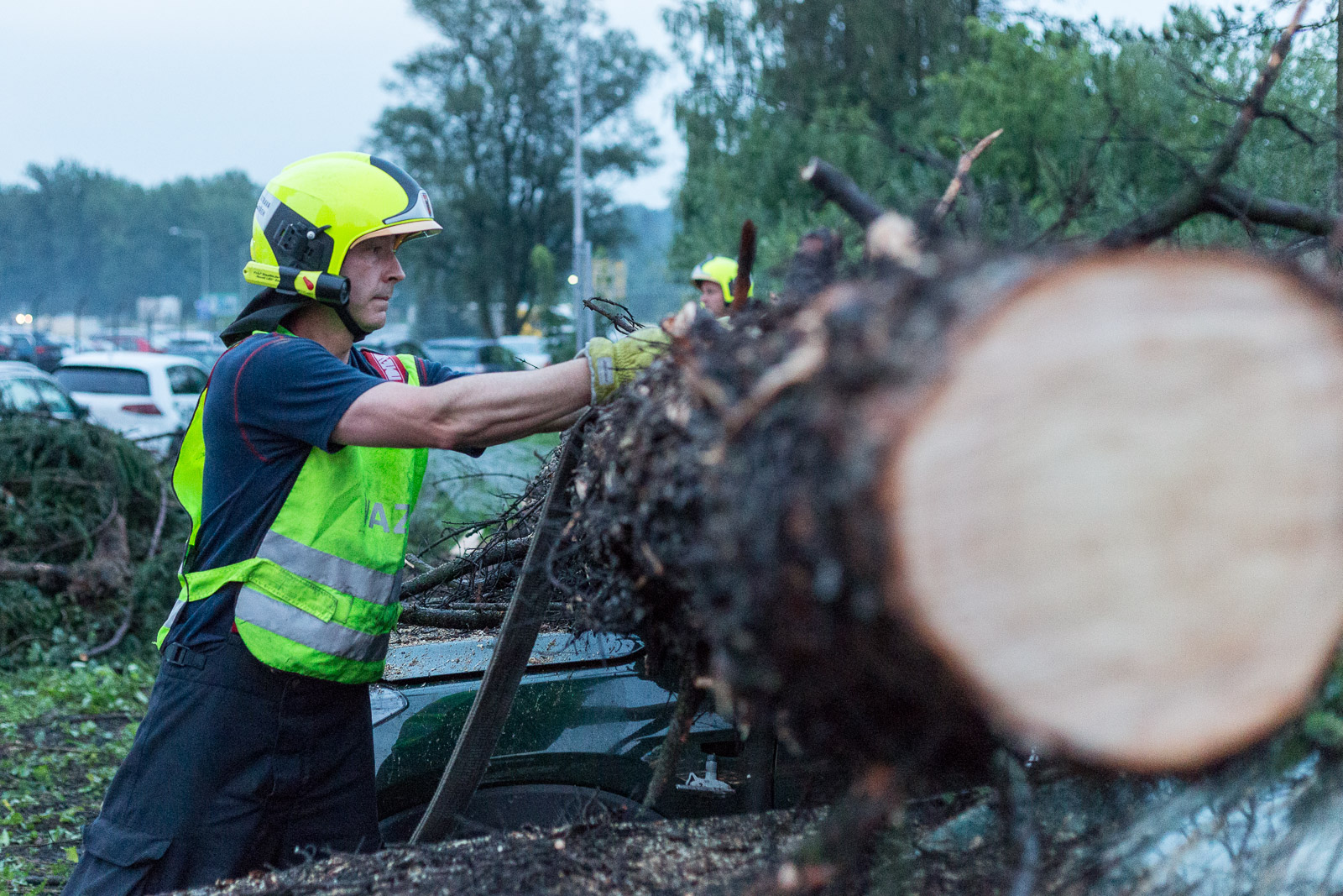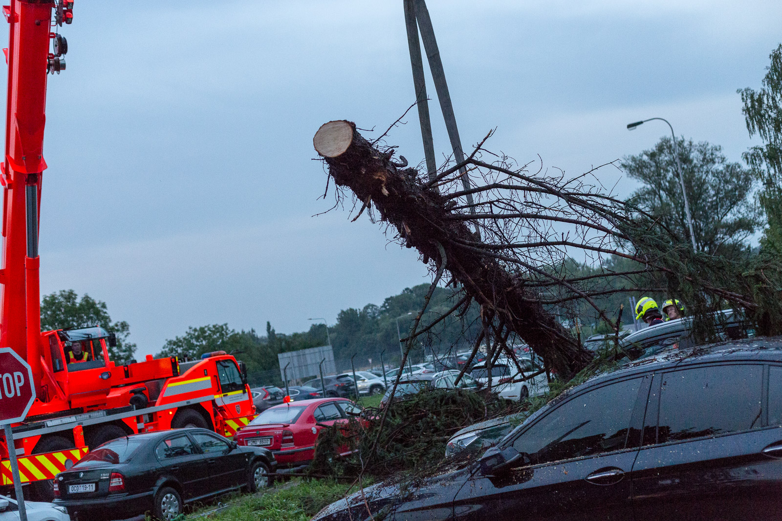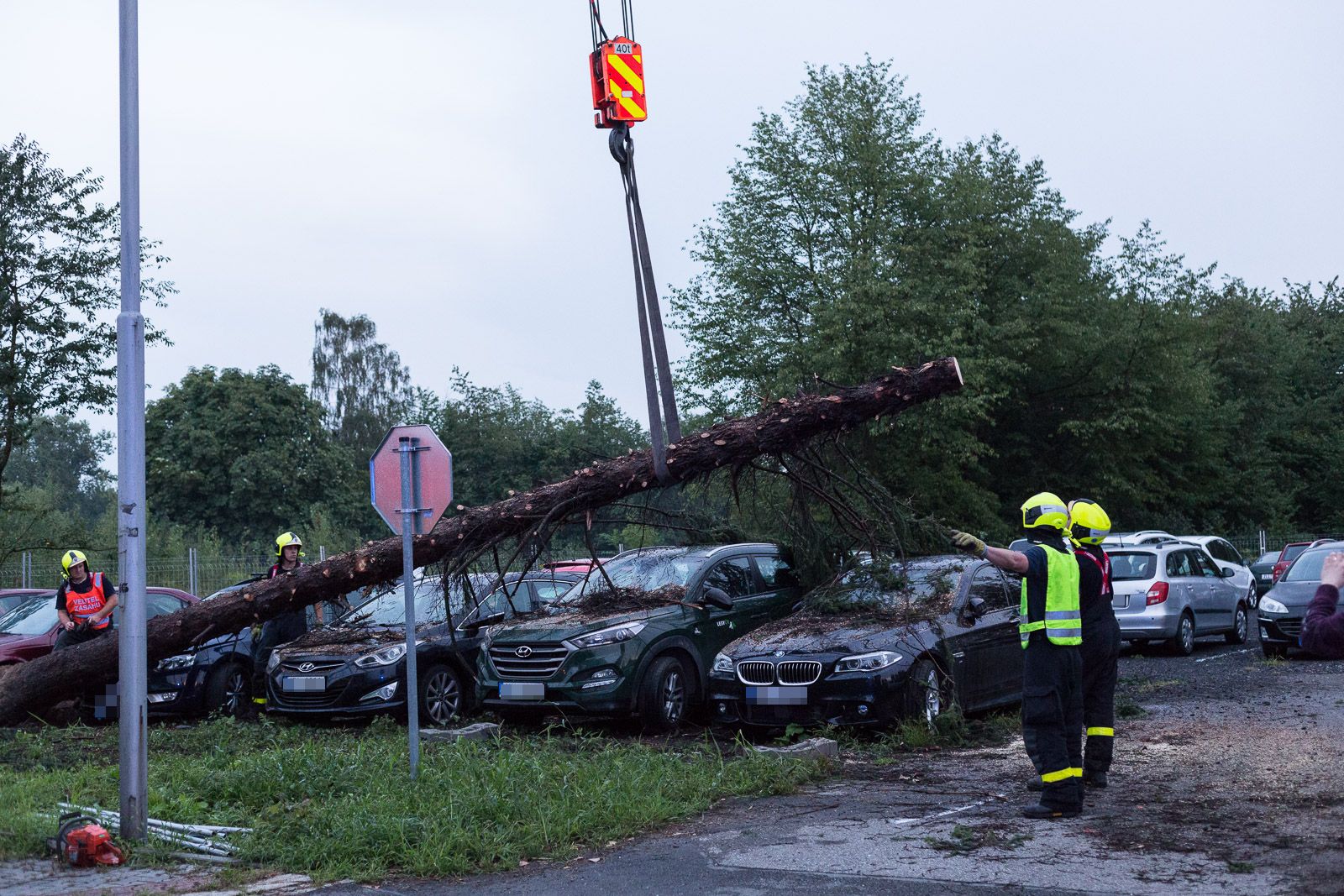 Celkem tři hasičské jednotky byly v pátek 27. července 2018 odpoledne vyslány do Mošnova na Novojičínsku, kde se poblíž odletové haly Letiště Leoše Janáčka Ostrava vyvrátil vzrostlý smrk na několik zaparkovaných vozidel.