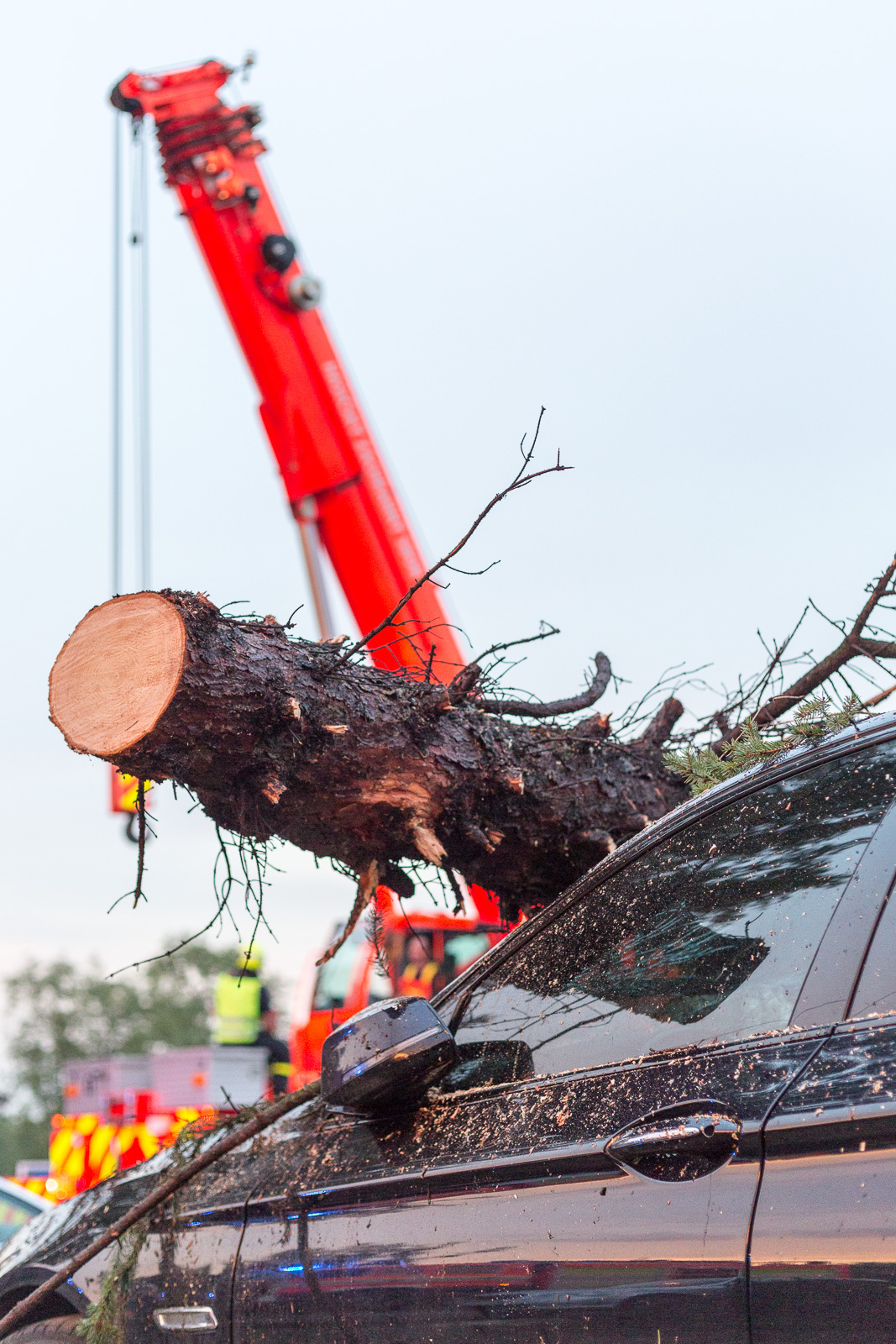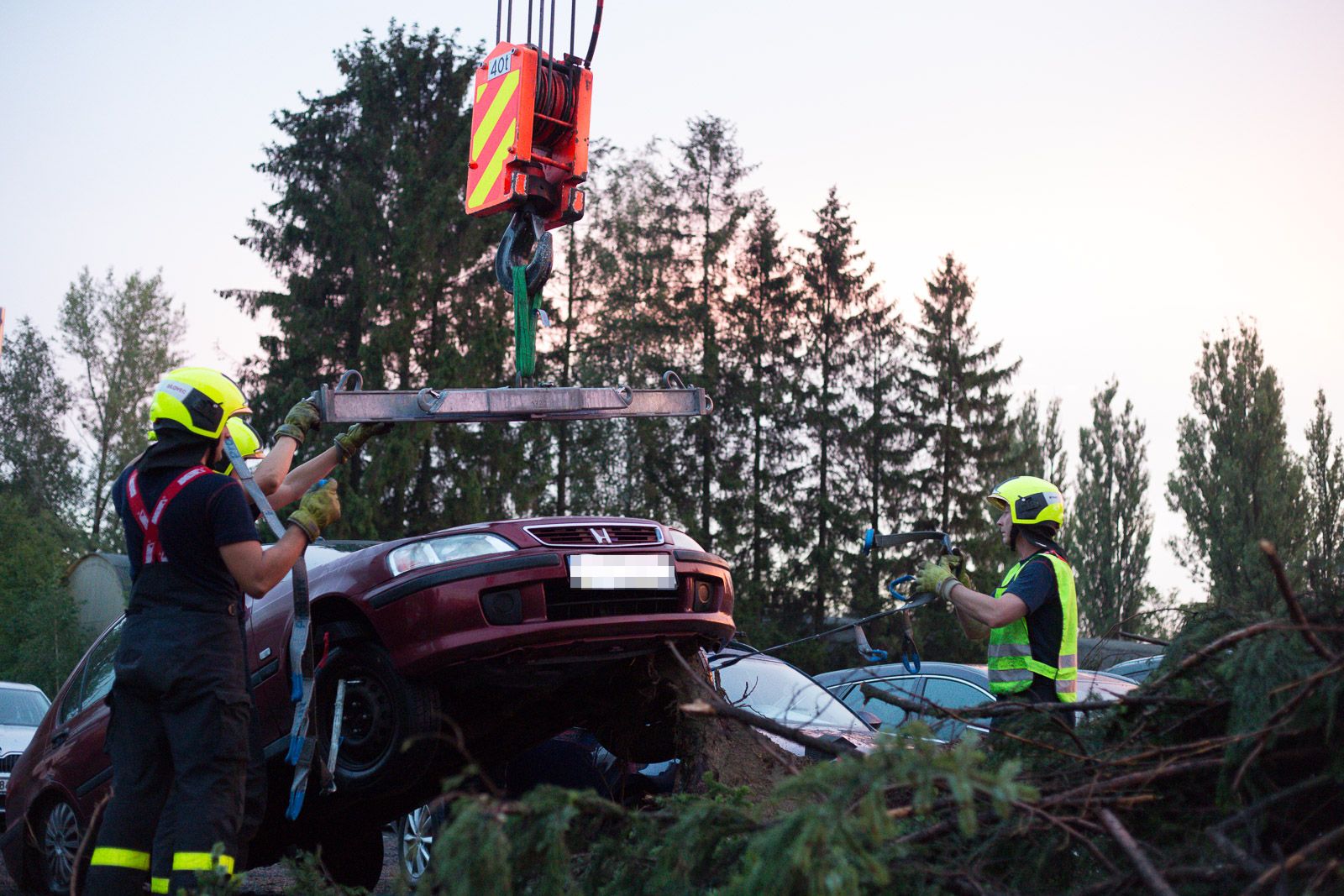 Hasiči vůz nejprve nadzvedli, kořen pod ním odřezali motorovou pilou a následně automobil položili zpět na kola. Jeřábem také odstranili samotný strom ze zbylých vozidel. Pro jeho bezpečné a stabilní uložení šikovně využili betonové patice ze zničeného plotu.