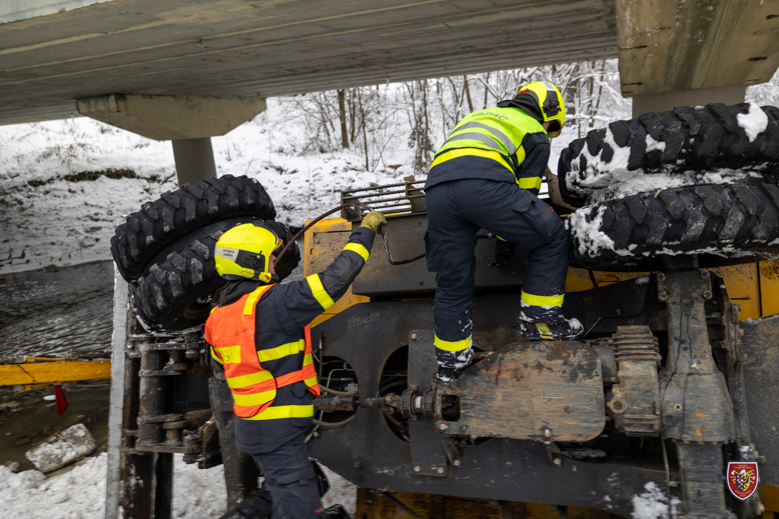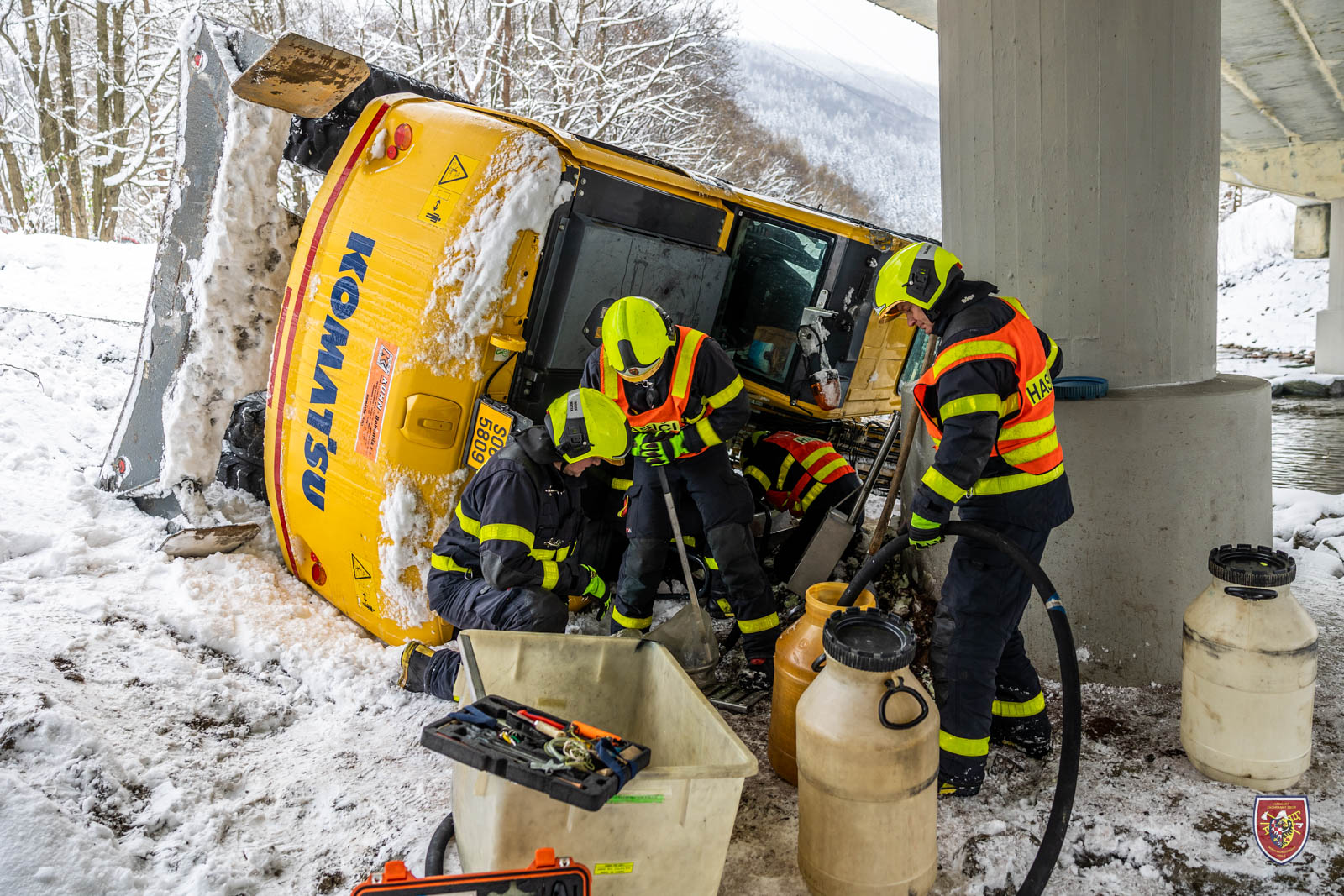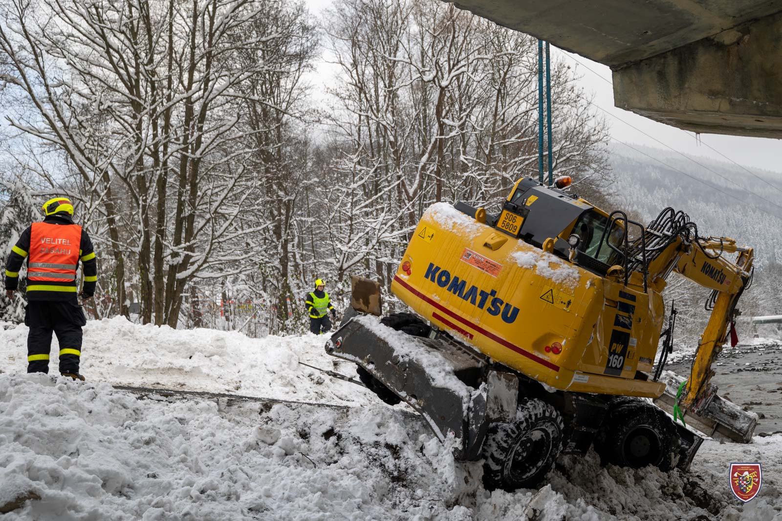 Bagr se při nehodě sesunul pod pilíř a nebylo ho tak možné postavit na kola pouhým převrácením zpět. Hasiči jej nejdříve museli popotáhnout mimo těleso pilíře a následně vyprostit přes kladku. K tomu využili jak navijáky obou tatrovek, tak automobilový jeřáb.