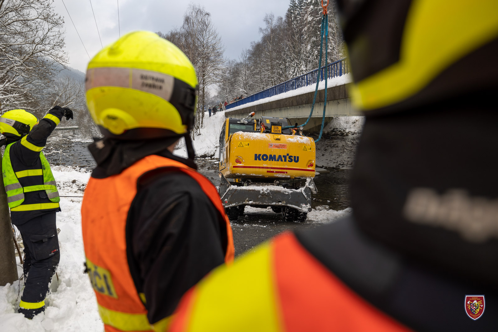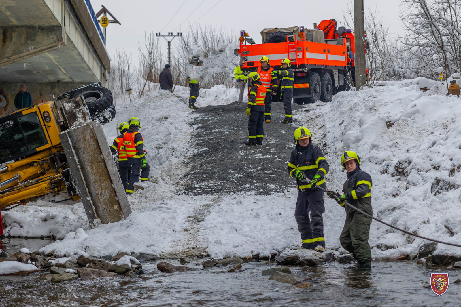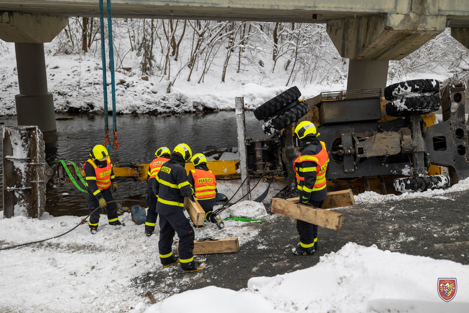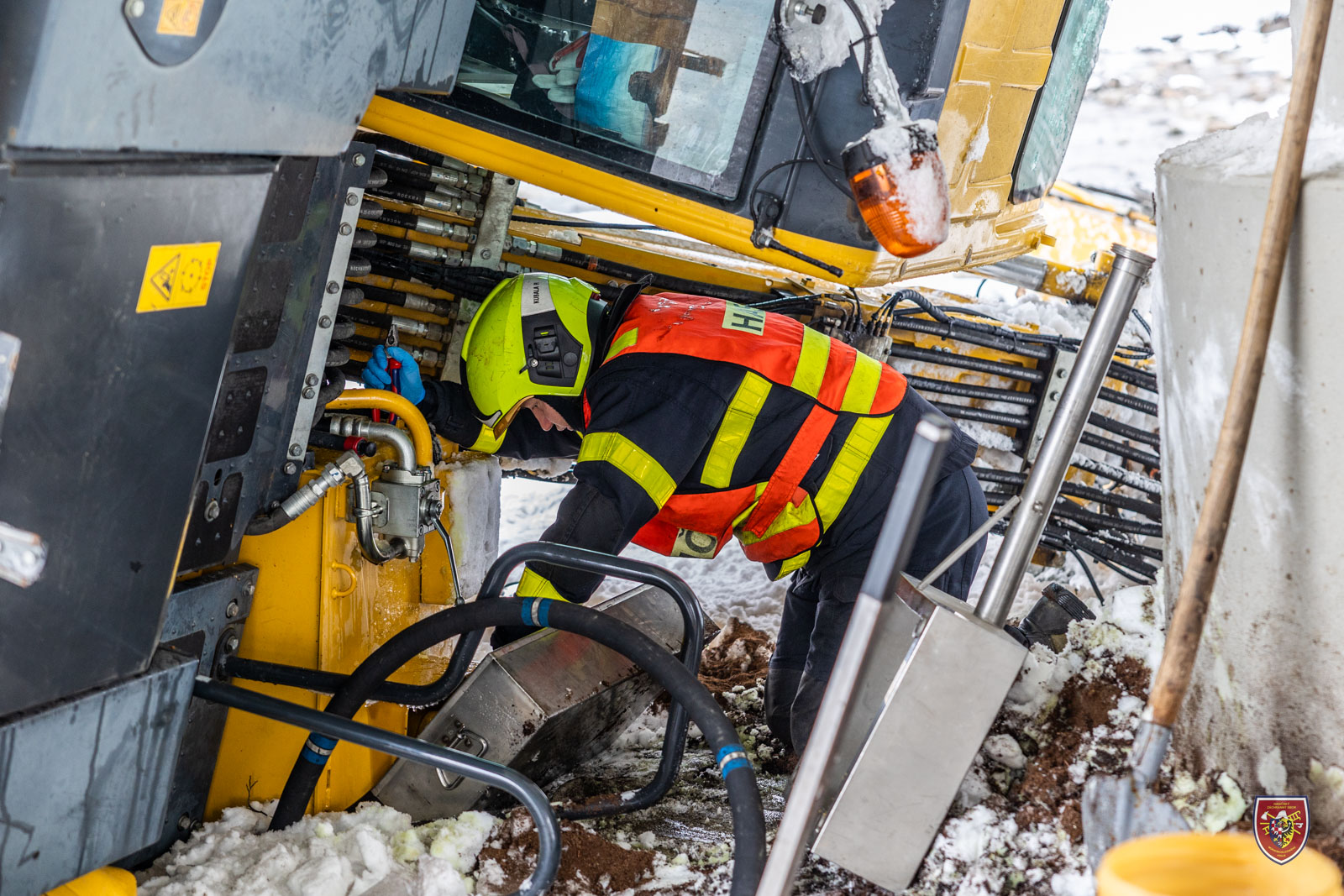 Bagr se při nehodě sesunul pod pilíř a nebylo ho tak možné postavit na kola pouhým převrácením zpět. Hasiči jej nejdříve museli popotáhnout mimo těleso pilíře a následně vyprostit přes kladku. K tomu využili jak navijáky obou tatrovek, tak automobilový jeřáb.