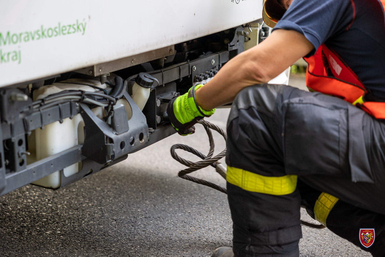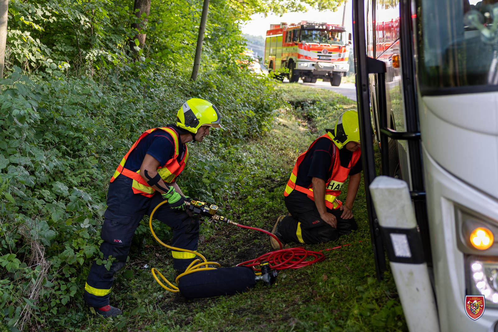 Velitel zásahu povolal na místo vyprošťovací automobil Mercedes Actros Bison ze stanice HZS MSK v Ostravě Zábřehu. Ještě před jeho příjezdem hasiči nadzvedli podvozek autobusu vysokotlakým pneumatickým vakem a pod kola podstrčili výdřevu.