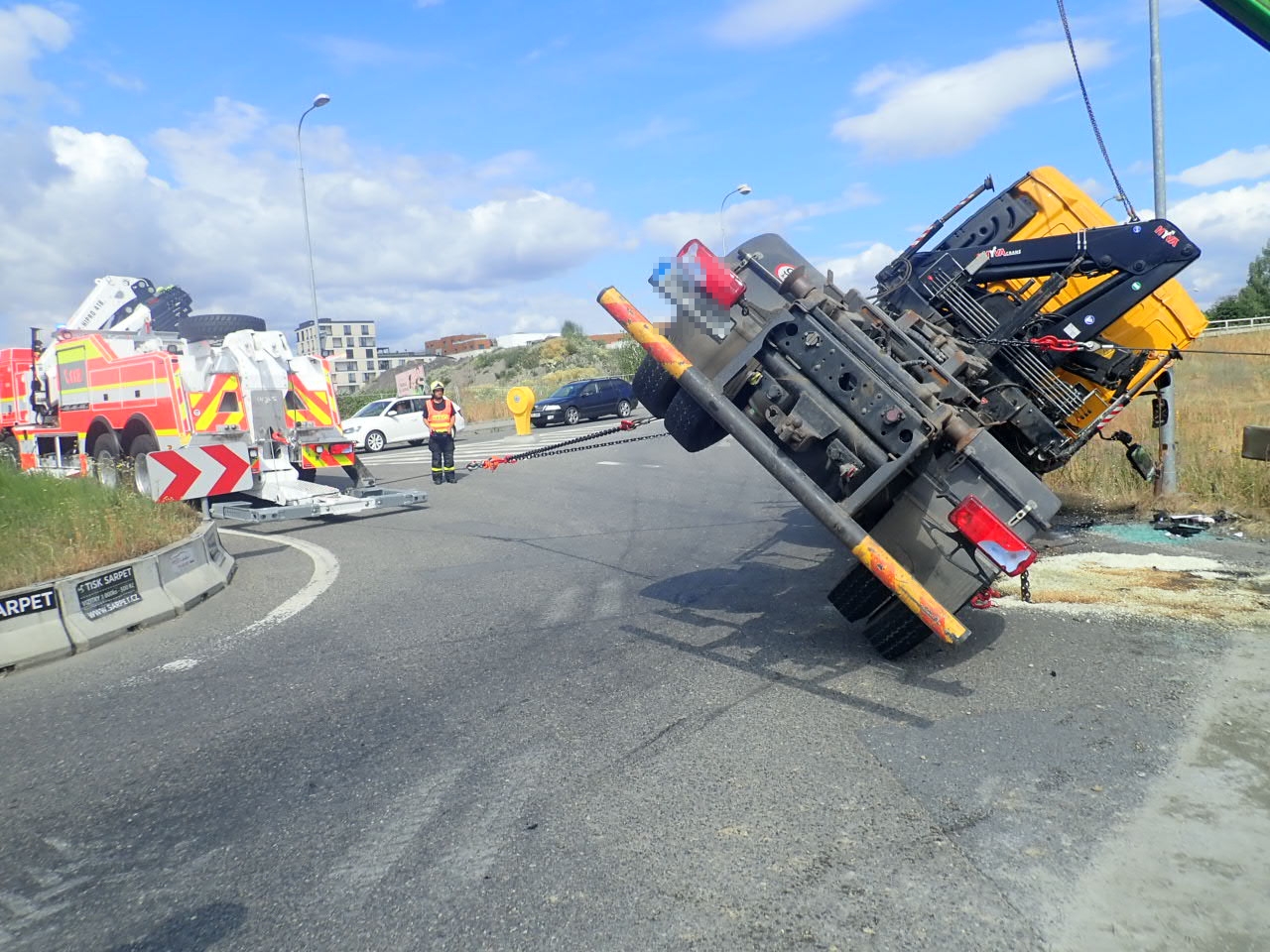 Ti po příjezdu k nehodě zjistili, že se nákladní automobil převrátil na kruhovém objezdu a uniká z něj nafta. Řidič byl zraněn, do...