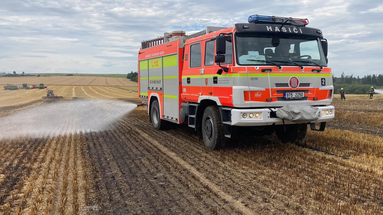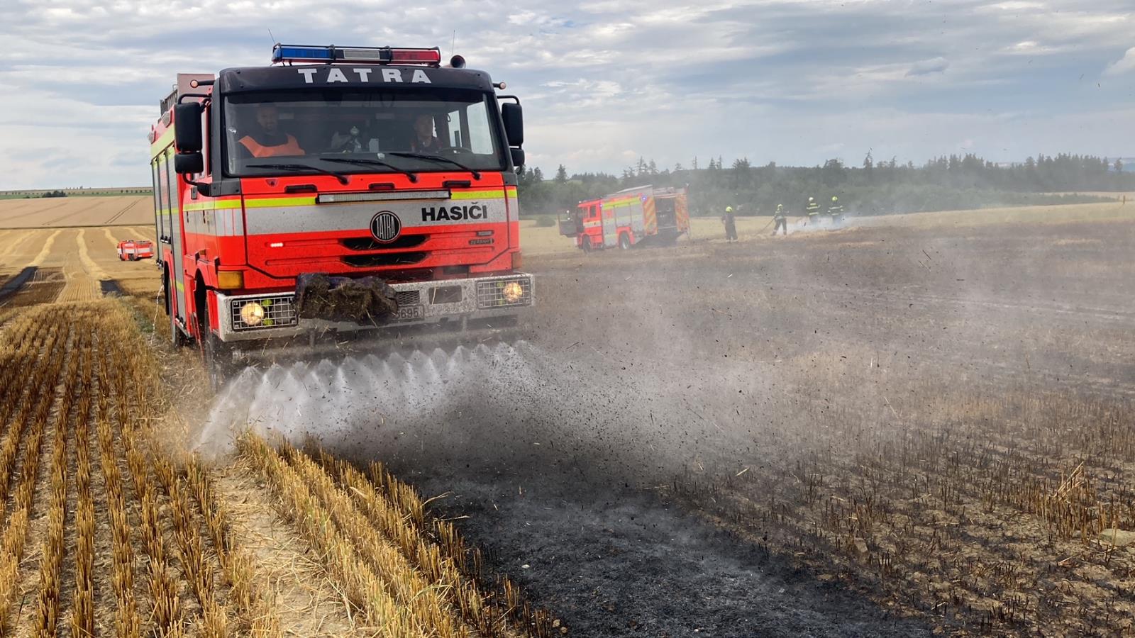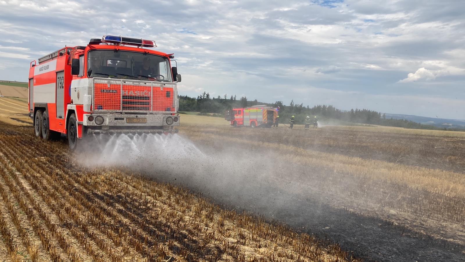 Škoda při zásahu nevznikla, plameny spolykaly pouze strniště. Příčinu vzniku zjišťuje vyšetřovatel.