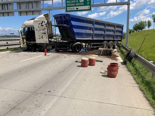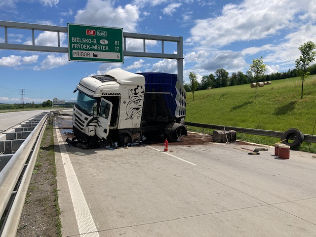 Z doposud neznámých příčin prorazil kamion betonová svodidla na dálnici D48, v katastru města Příbor. Při nehodě došlo k poškození nádrží s motorovou naftou, která se vylila na dálnici a do přilehlého okolí. Hasiči tedy po příjezdu na místo události provedli protipožární opatření a ihned začali zasypávat rozlitou naftu. Jelikož došlo k rozlití 1000 l motorové nafty, byl na místo události vyslán i sorbentový automobil, který dovezl zasahujícím hasičům větší množství savého sypkého materiálu. Hasiči současně poskytli zraněnému řidiči kamionu předlékařskou pomoc a po příjezdu posádky záchranné služby ho předali do péče zdravotníků. Jelikož došlo k úniku pohonných hmot i do půdy, byla na místo vyžádána i inspekce životního prostředí.