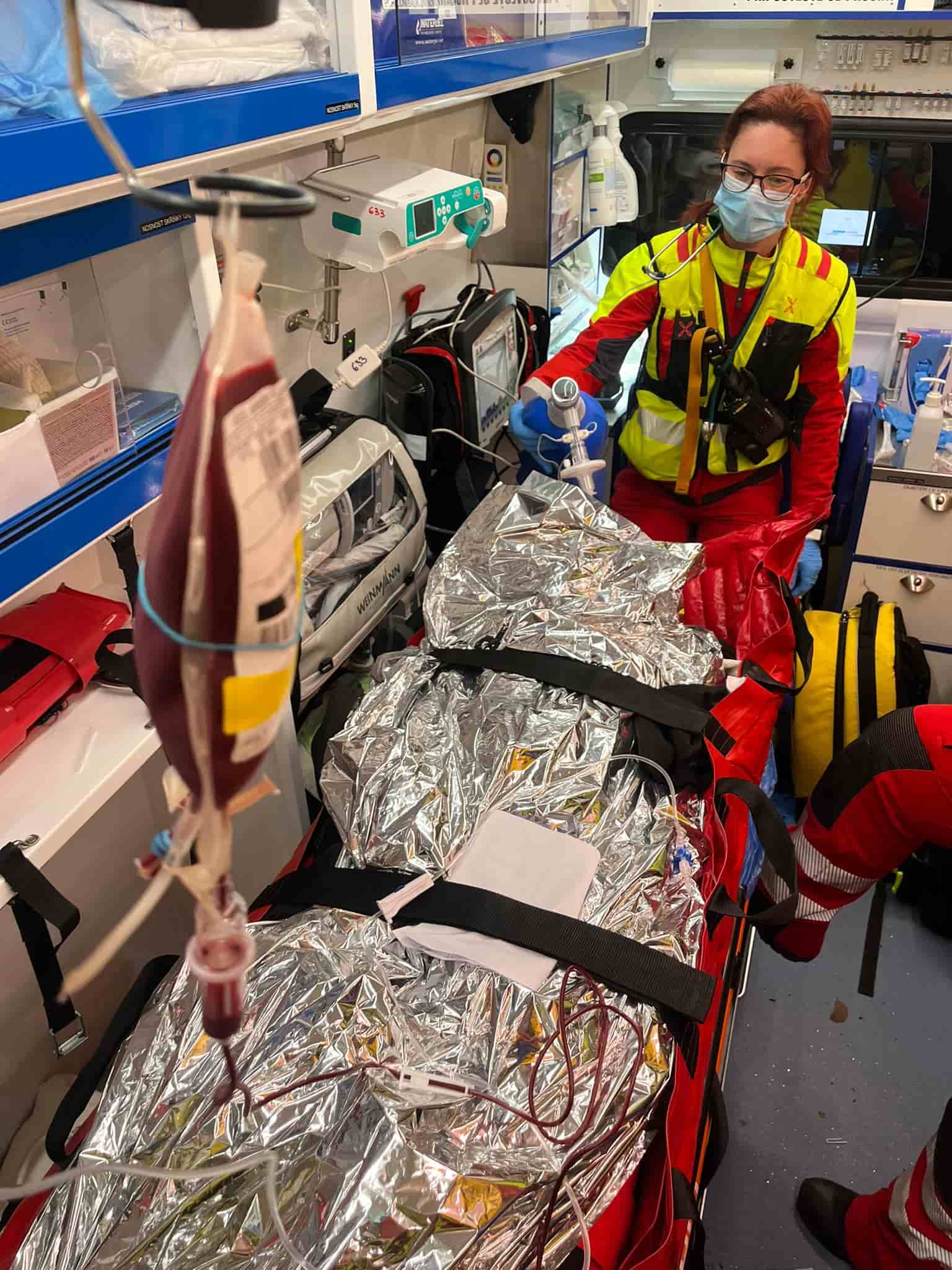 Zraněný skončil pod úrovní silnice, což výrazně zkomplikovalo přístup k němu. Záchranáři jej museli nejprve bezpečně vyprostit a následně zahájili intenzivní ošetření. Muž utrpěl vážné poranění dolní končetiny a došlo k masivní krevní ztrátě. Zasahující tým použil škrtidlo, provedl znehybnění a zajistil žilní vstupy pro podání léků. Vzhledem ke zhoršujícímu se stavu bylo nutné zajistit dýchací cesty a napojit pacienta na umělou plicní ventilaci. Součástí péče bylo také podání transfuze přímo na místě zásahu.